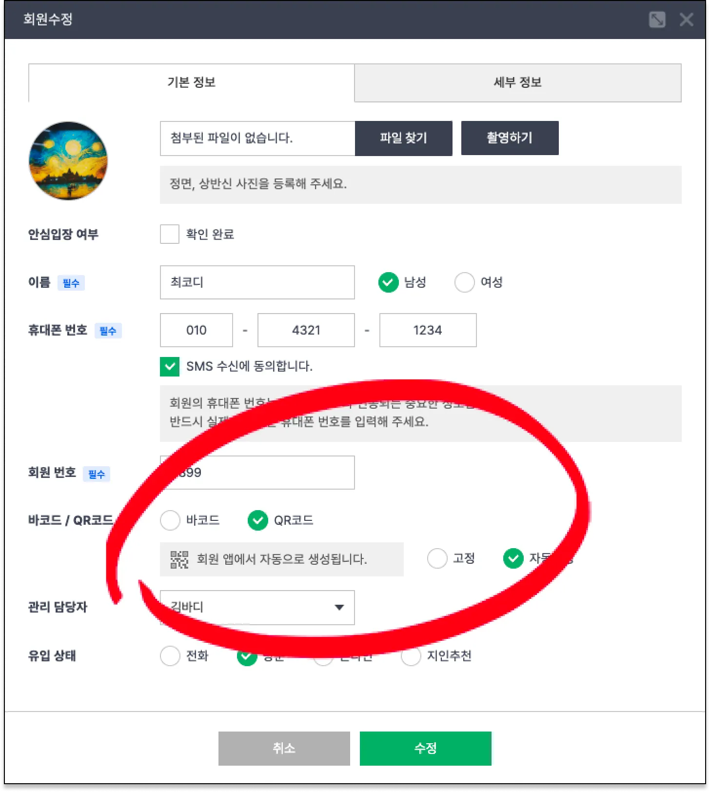 회원 상세 > 회원 수정에서 회원의 사진을 업로드 하거나, 카메라가 있다면 즉시 촬영해서 사진을 등록할 수 있어요.