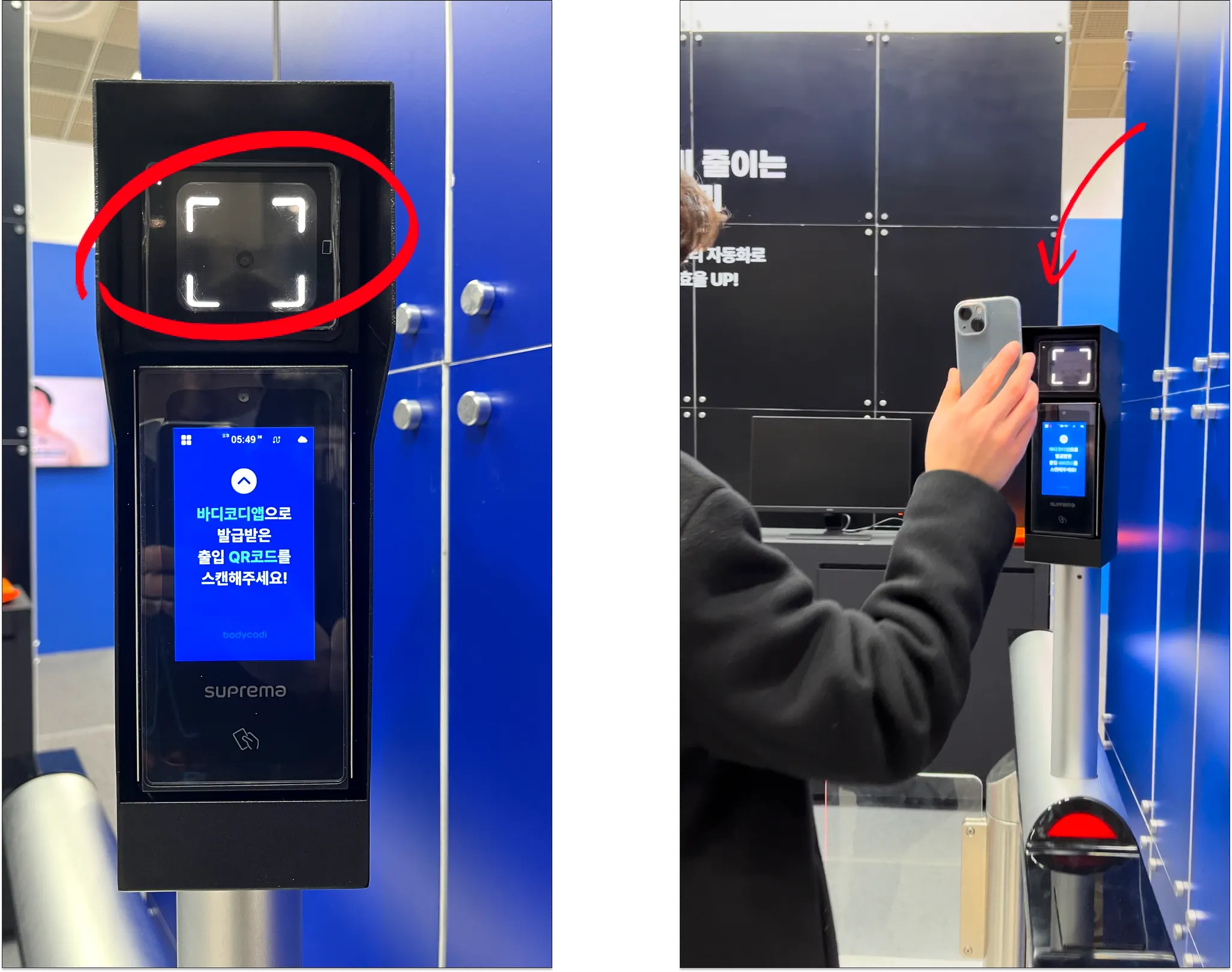 슈프리마의 QR코드 인증 단말기 XS2-QR로 바디코디와 연동했을 때, 회원이 QR코드로 입장하는 방법이에요.