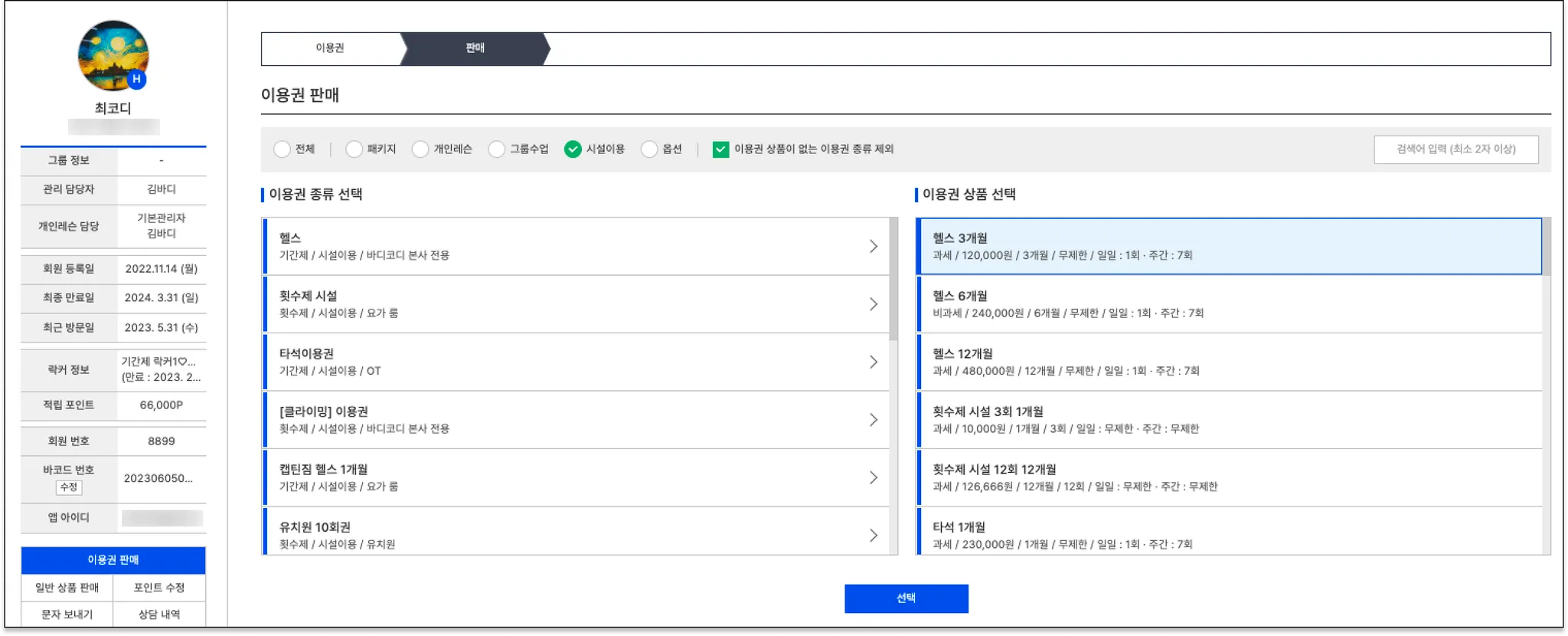 회원 상세 > 이용권 판매 > 시설 이용권 상품 선택 > 이용권 판매에서 이용권을 판매해주세요.
