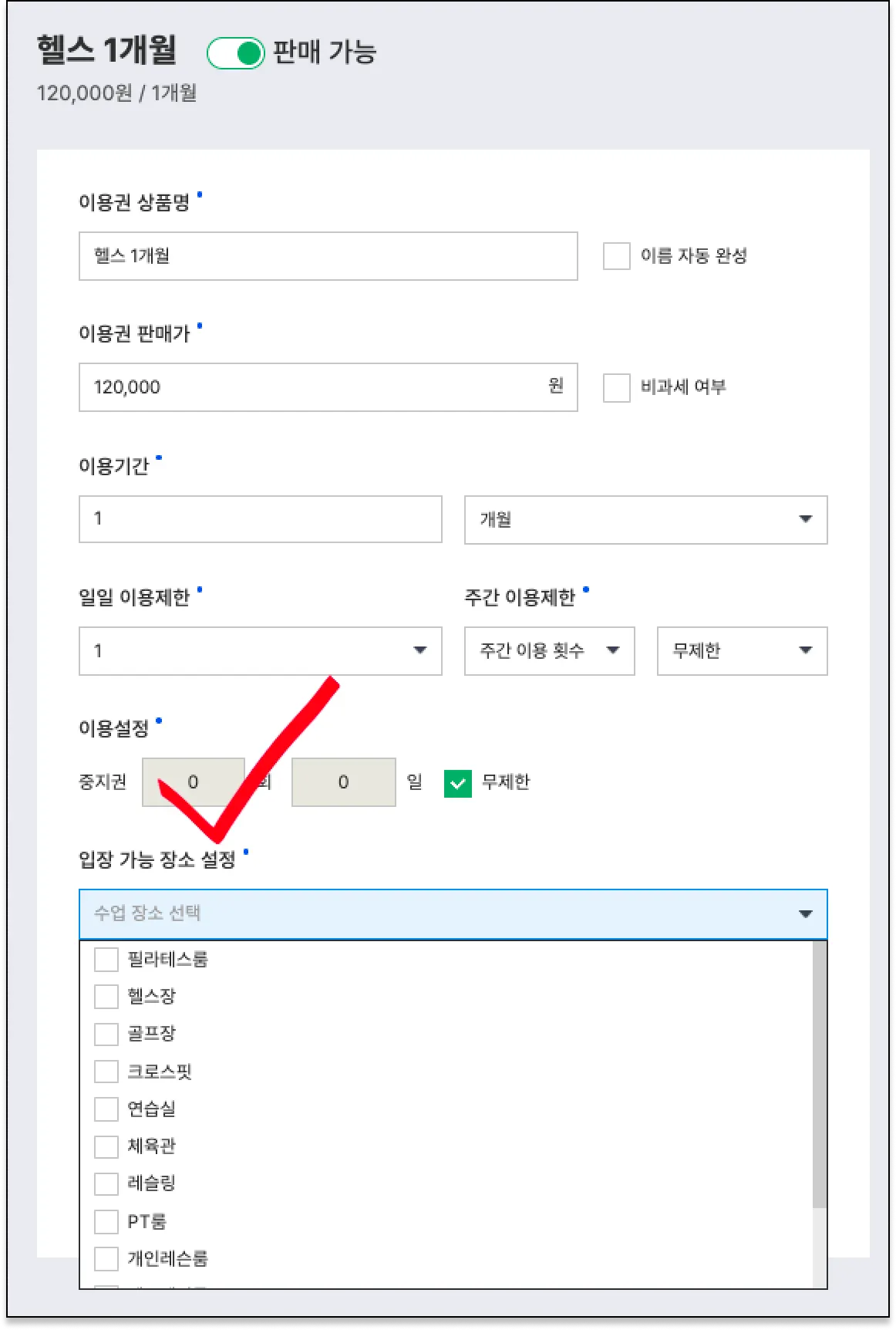2. 시설 이용권에 입장 가능 장소 설정하기
