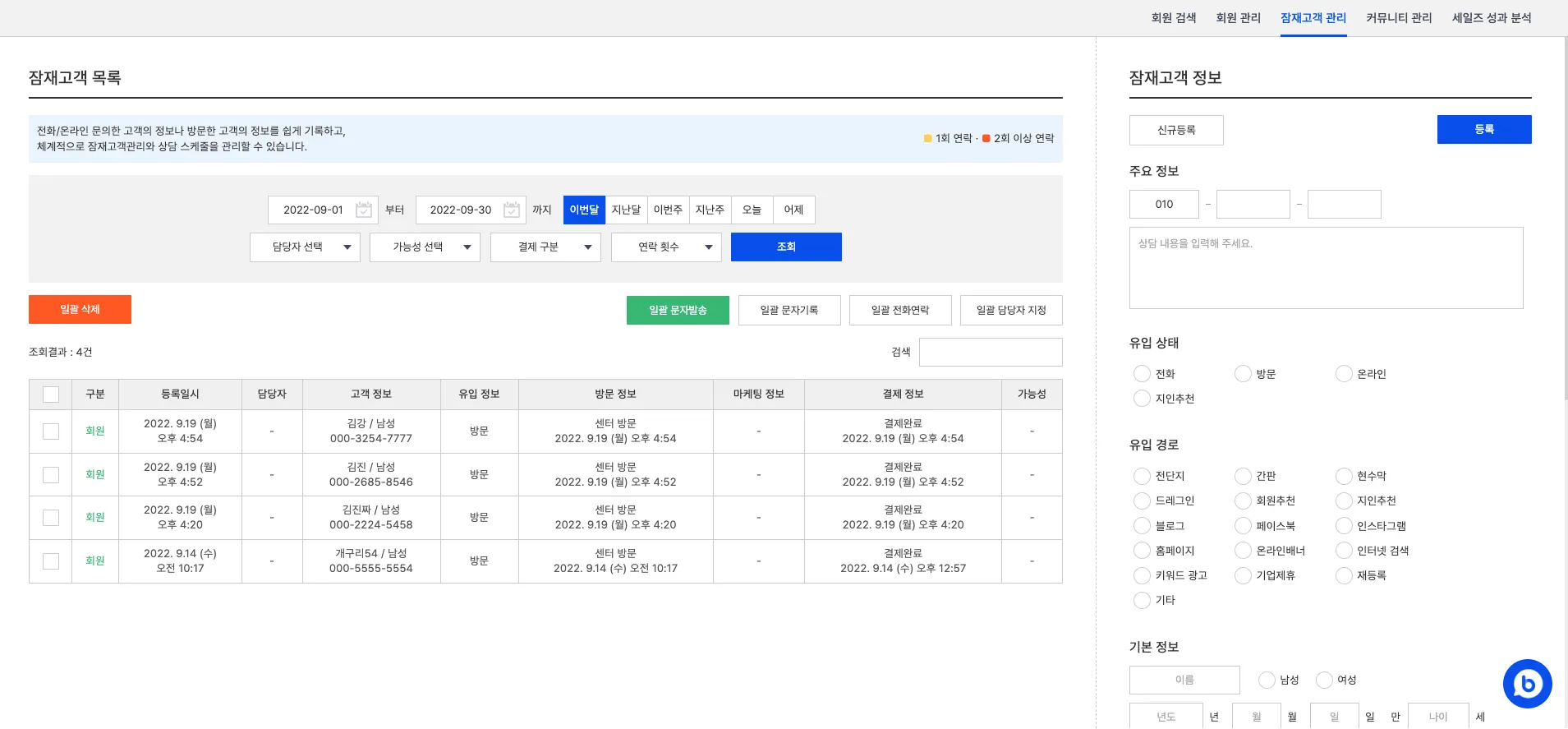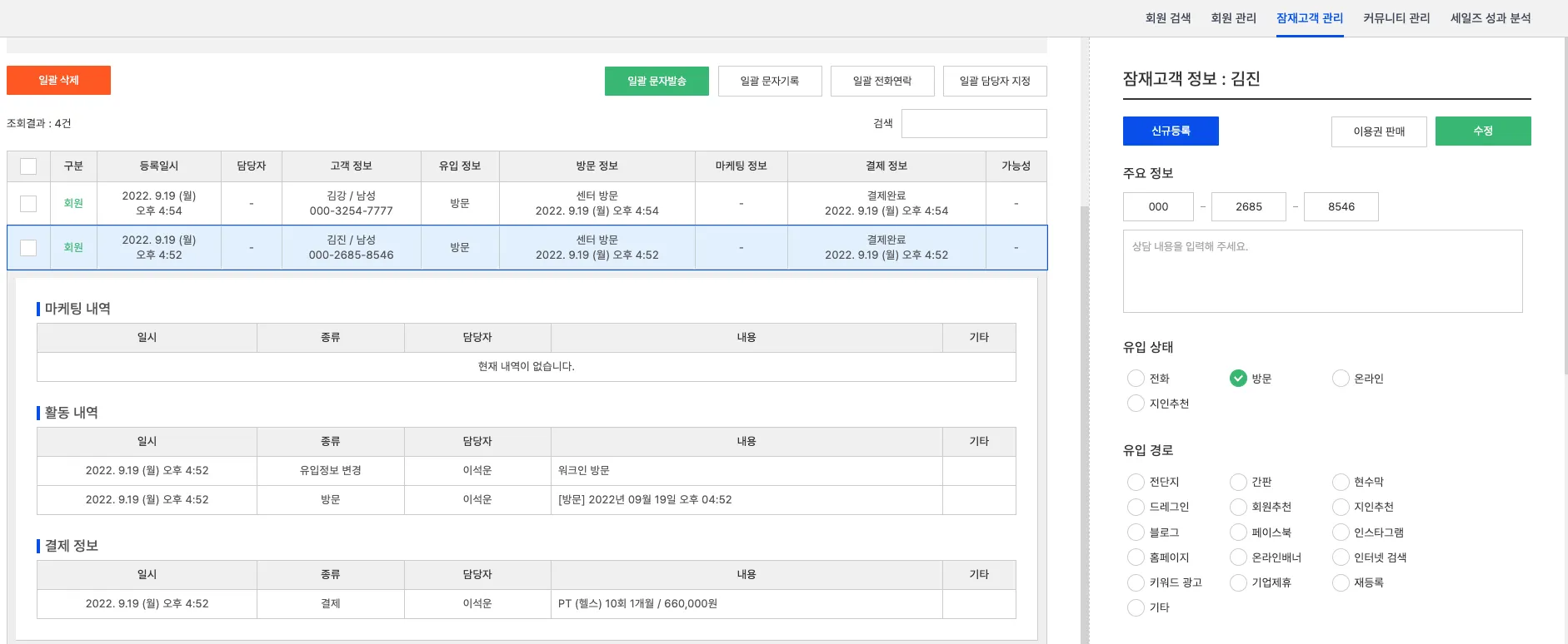 해당 고객에 대한 정보를 찾아서 추가 상담내용을 기입하거나 방문 기록을 남기고 회원으로 등록과 결제 등의 절차를 진행할 수 있습니다.