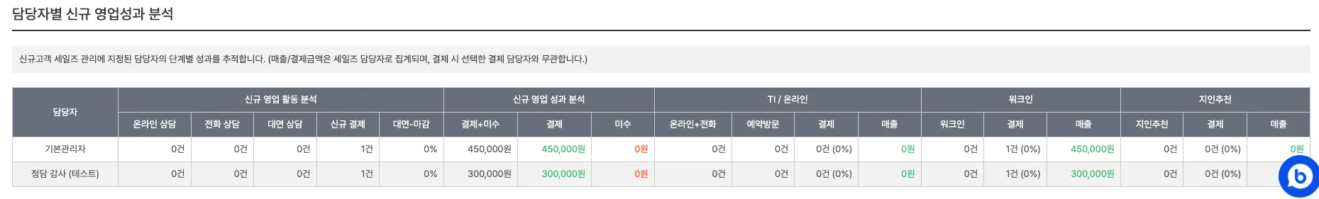 성과분석 페이지에서는 판매 담당자들(FC/상담자)의 영업 성과를 분석할 수 있습니다.
