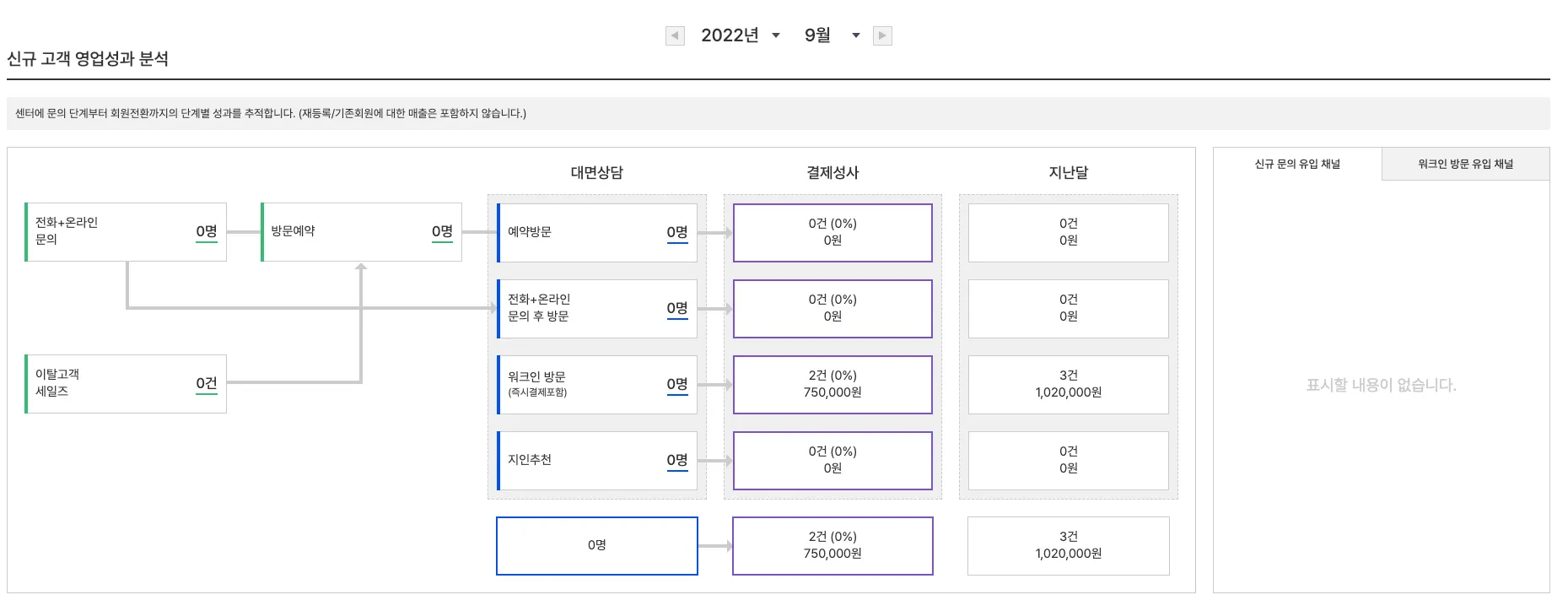 센터 방문고객 몇명을 상담해서 몇명에게 판매했는지 이에 대한 매출은 얼마인지를 분석할 수 있습니다.