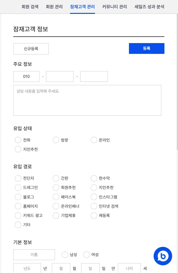 ※ 휴대폰 번호 입력 시, 기존회원이나 잠재고객에 이미 등록된 사람이라면 해당 고객에 대한 기존 정보를 자동으로 불러옵니다.