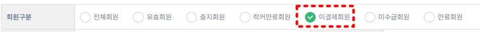 고객 관리 → 회원 검색 → 회원 구분 내 ‘미결제 회원’ 체크