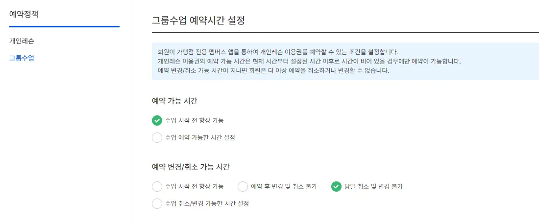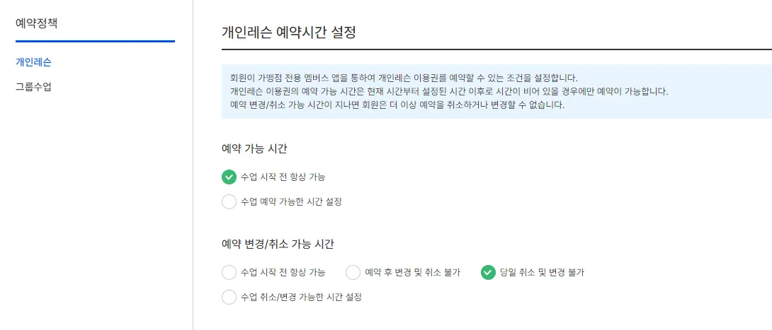 센터관리 > 예약정책 메뉴에서 개인레슨/그룹수업 예약정책을 설정할 수 있어요