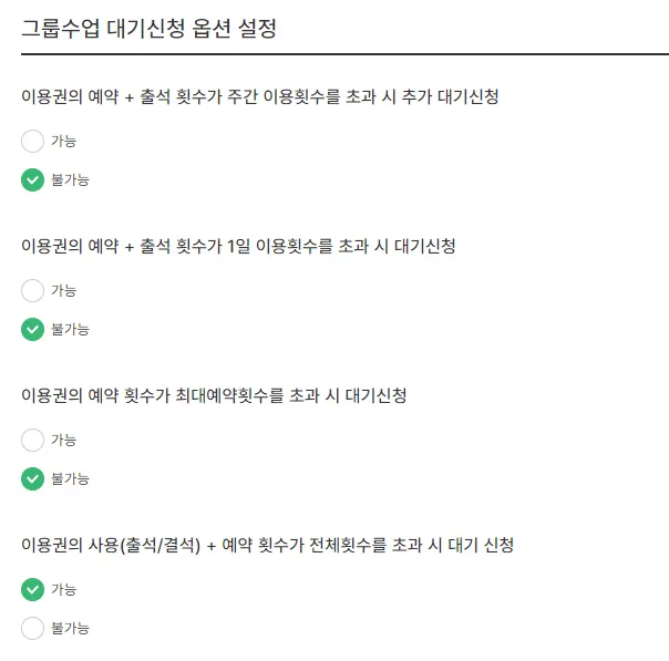 회원이 보유한 이용권의 1일 이용횟수가 1회인 이용권일때 예약+출석 횟수가 1회를 초과했더라도 예약대기를 걸 수 있는지 설정하는 기능이에요.