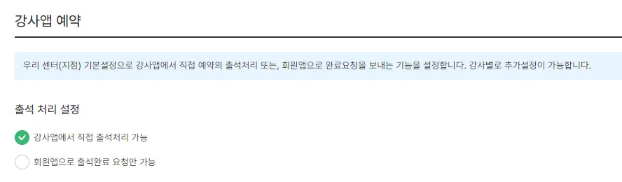 단, 해당 기능은 센터관리 > 권한관리 메뉴에서 개인레슨 예약 출석/결석에 관한 권한이 필요해요.
