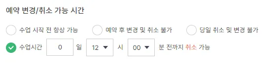 수업 취소/변경 가능한 시간 설정 : 수업 시작 시간 기준 얼마 전까지 취소할 수 있는지 설정하는 기능