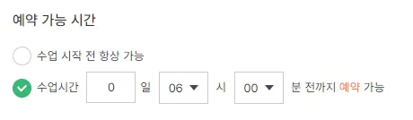 수업 예약가능한 시간 설정 : 개설된 그룹수업의 시작 시간을 기준으로 얼마 전까지 예약할 수 있는지 설정하는 기능