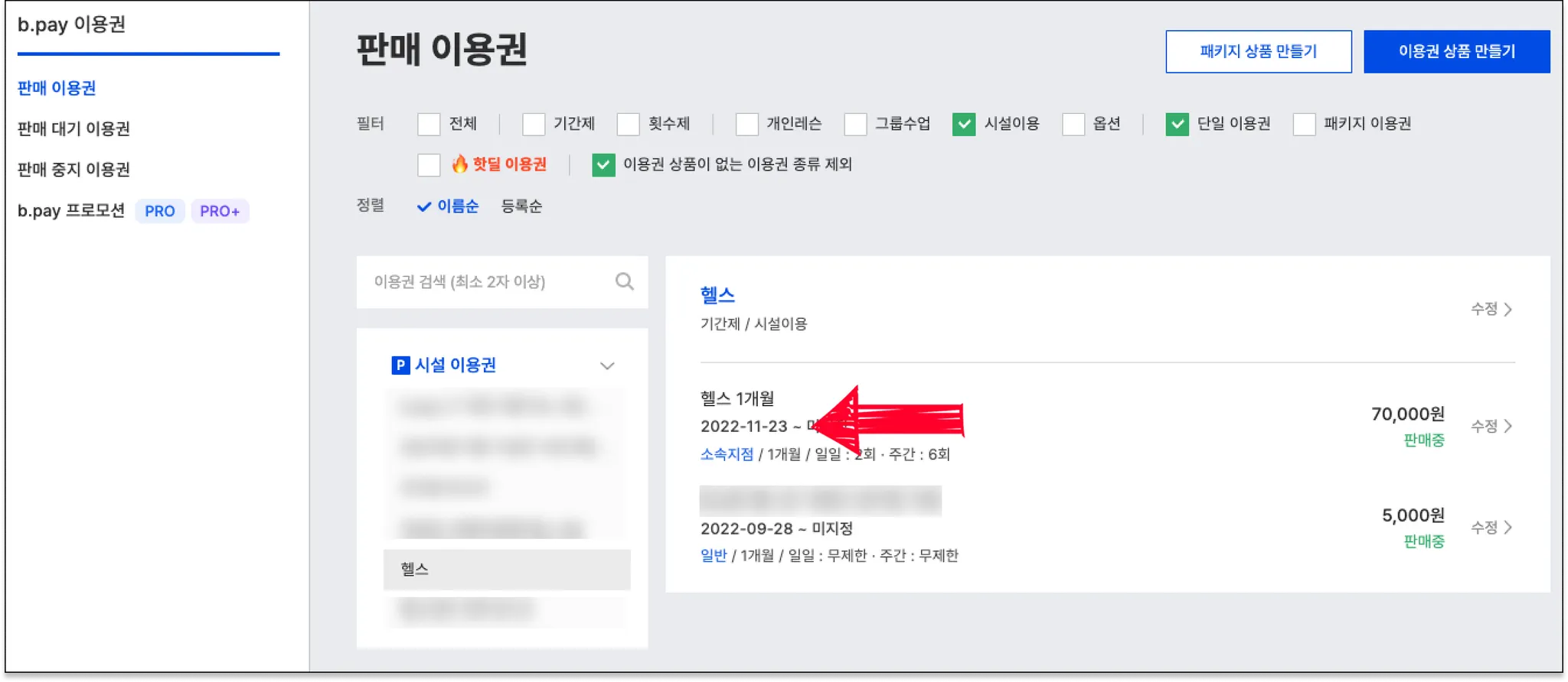 이용권 관리 > b.pay 이용권 > 판매 이용권에서 이용 가능한 지점을 수정할 이용권을 선택하세요.