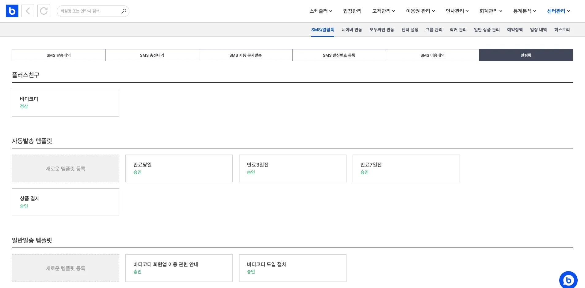 센터관리 > SMS/알림톡 > 알림톡 메뉴에서 등록한 템플릿을 확인하실 수 있습니다.