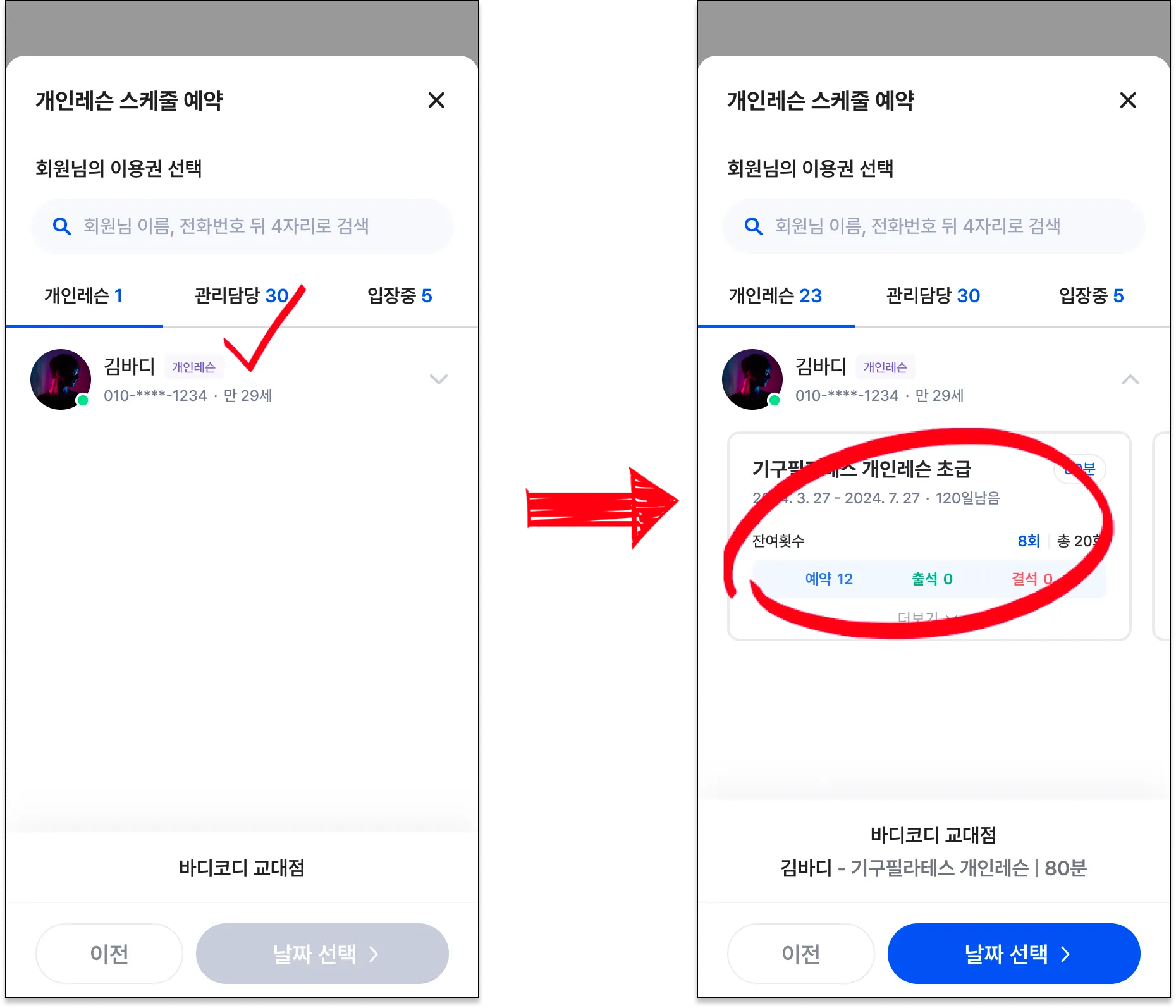 강사앱에서 회원 개인레슨 예약 시 회원이 가진 이용권을 보여주고, 해당 이용권으로 레슨을 예약할 수 있습니다.