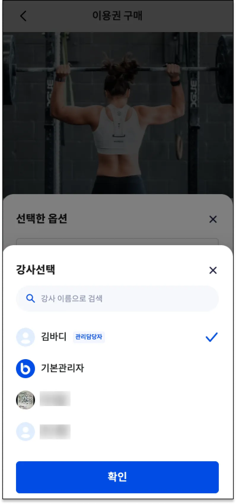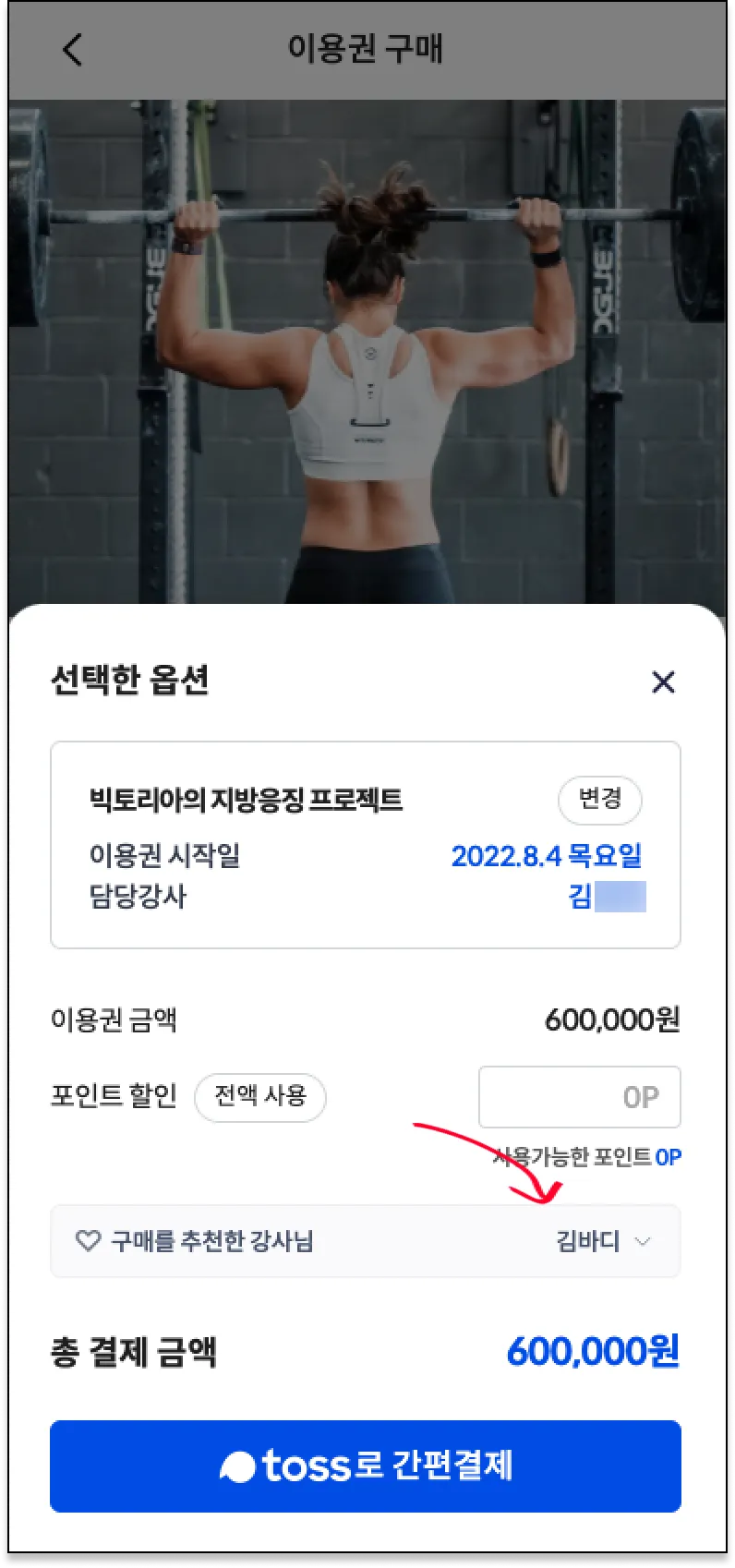 바로 ‘회원앱에서 b.pay로 이용권 구매 시 추천강사 선택’ 기능입니다.