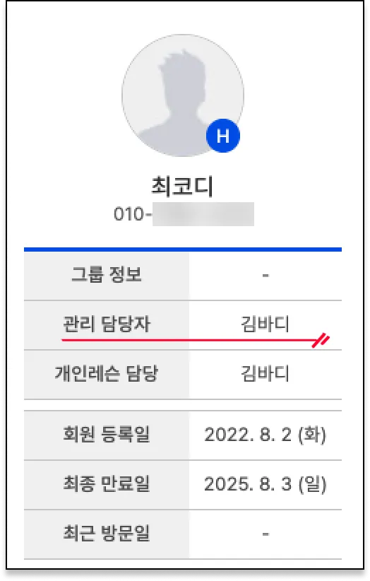 바디코디 회원관리프로그램(CRM)은 회원당 1명씩 관리담당자를 지정할 수 있습니다.