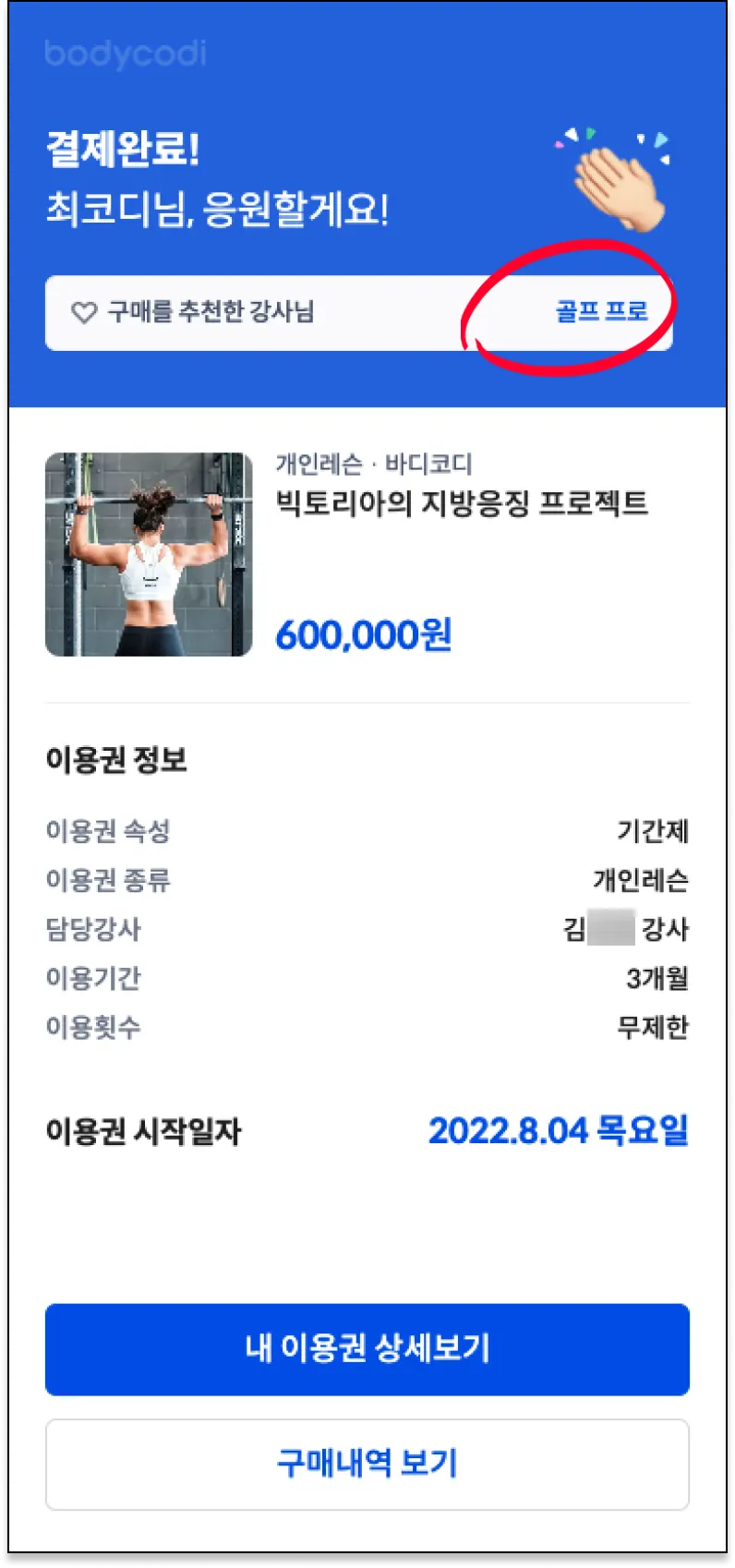 자! 회원앱에서 추천강사를 설정하고, 결제까지 완료되었습니다.