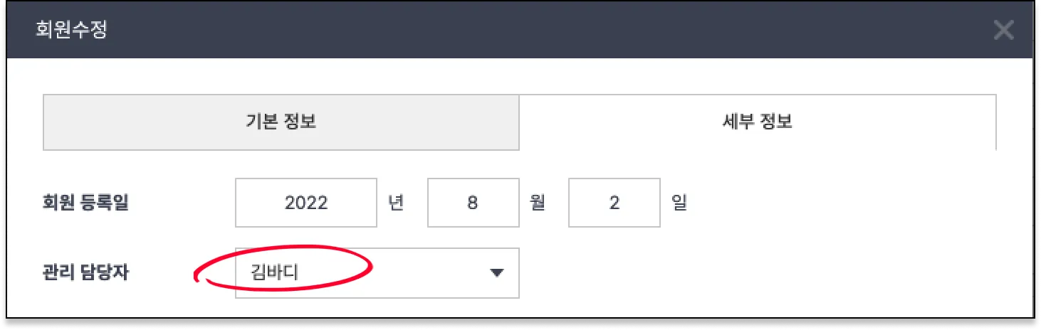 회원정보 수정에서 세부정보로 접속하면 관리 담당자를 확인, 수정할 수 있습니다.