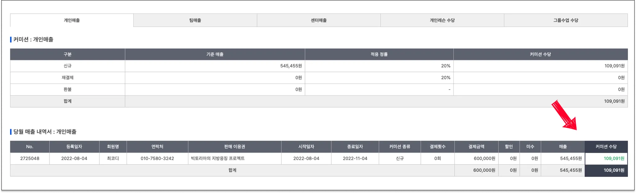 임직원 자신이 담당하는 회원이라해도 b.pay 이용권 결제금액이 개인 매출에 반영되지 않았습니다.