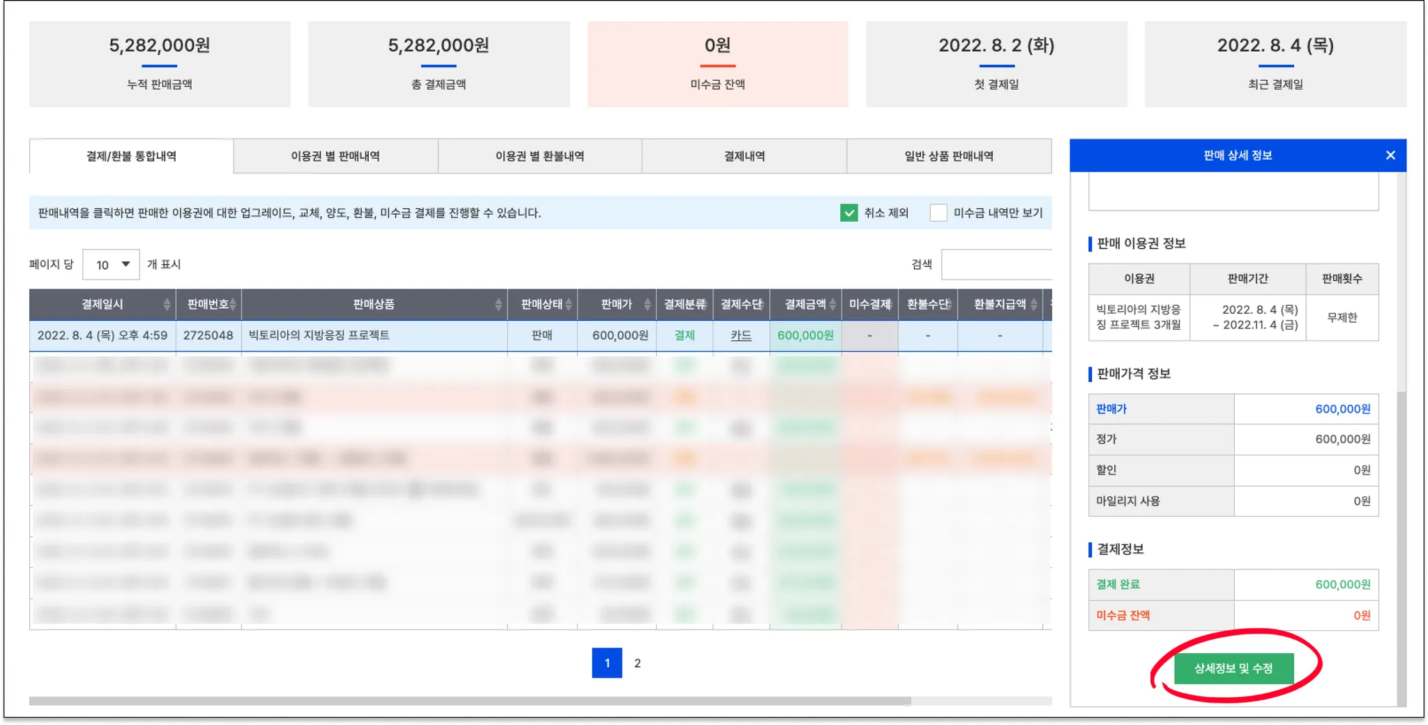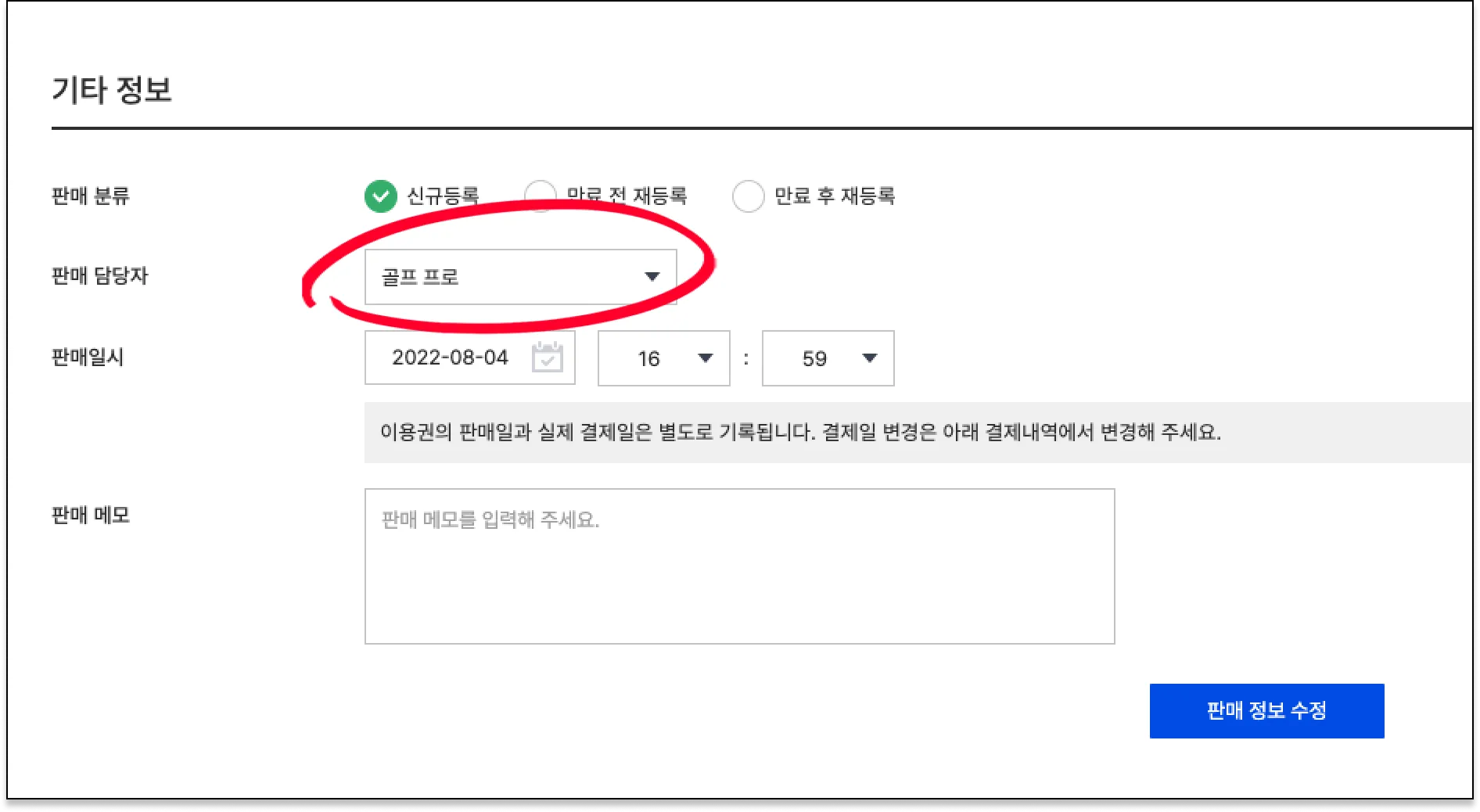 앱에서 결제 시 지정한 ‘추천 강사’가 판매담당자로 지정되어 있습니다. 잘못 지정한 경우 수정할 수 있어요