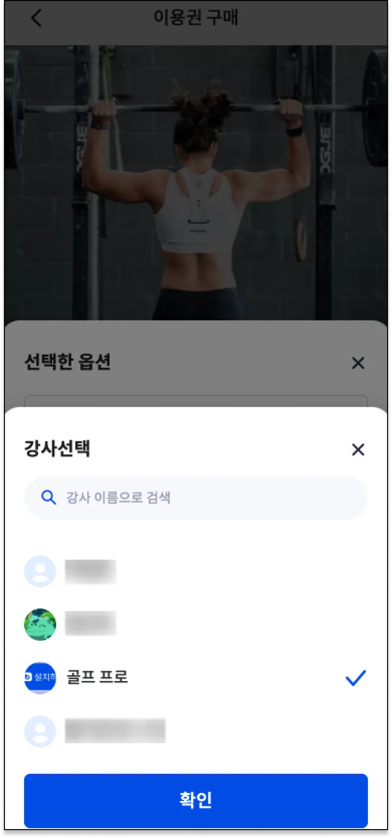 1. 회원앱에서 b.pay 이용권 구매 시 결제 이전 ‘추천강사'를 선택할 수 있습니다.