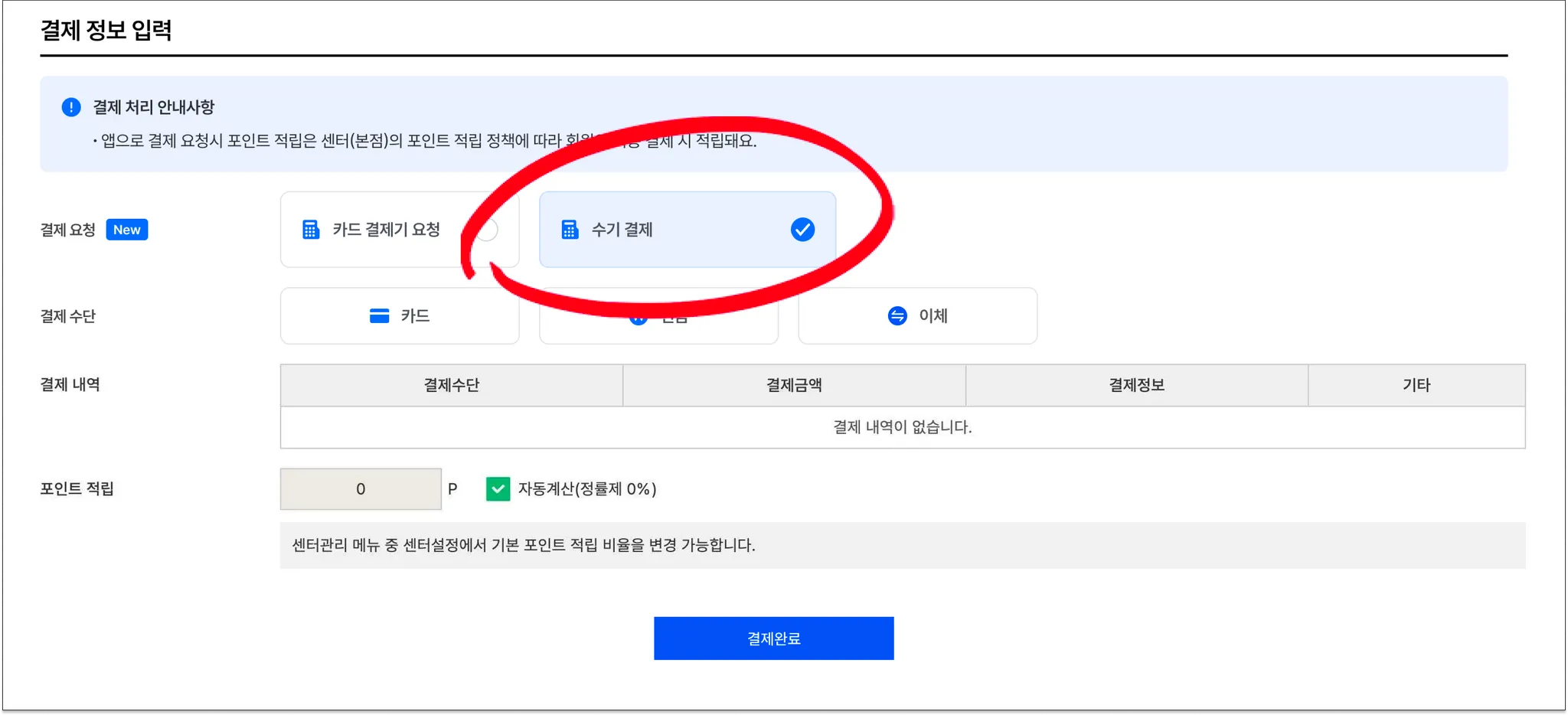 결제 정보 입력에서, 수기 결제를 선택 후 현금이나 이체 내역을 추가해주세요!