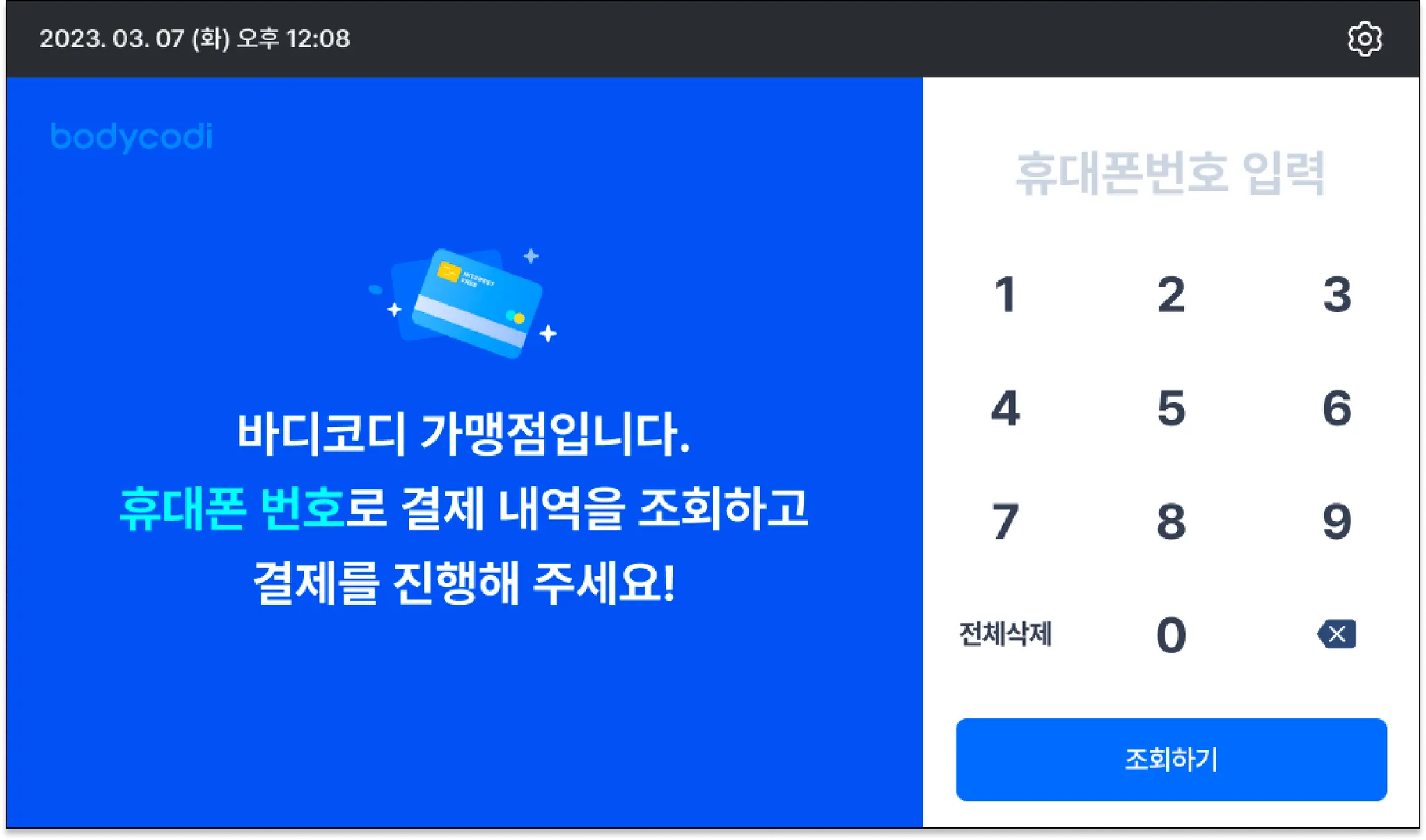 바디코디 전용 POS기 화면입니다. CRM에서 판매 후 휴대폰번호를 입력하면 결제 요청 내역을 확인할 수 있어요.