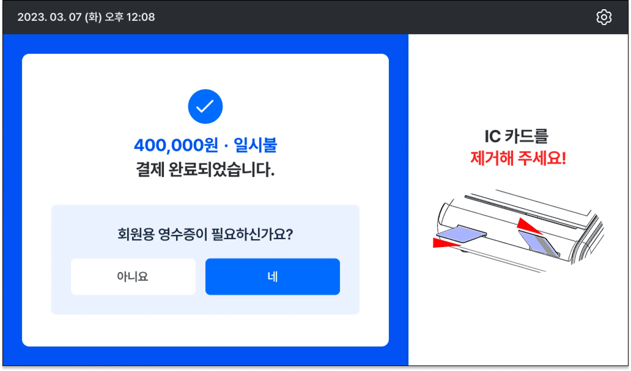 회원용 영수증이 필요할 경우 ‘네’ 버튼을 눌러 영수증을 전달해주세요.