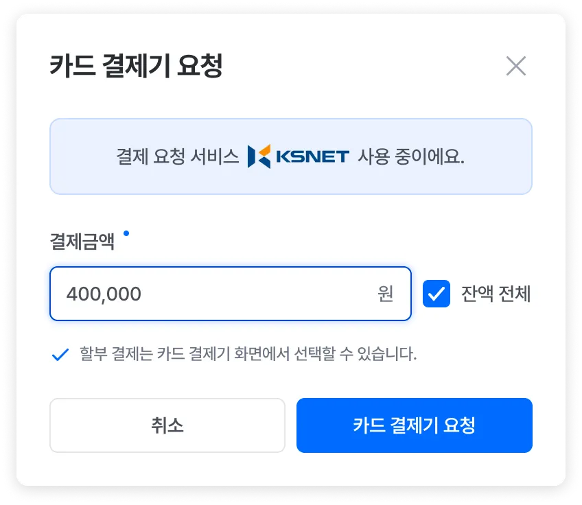 결제 요청에서 ‘카드 결제기 요청’을 선택해주세요.