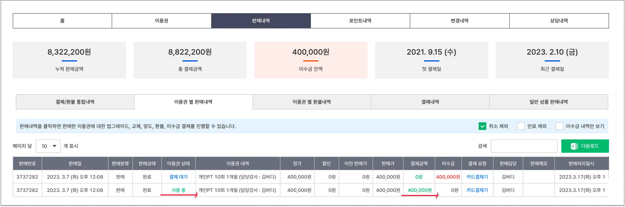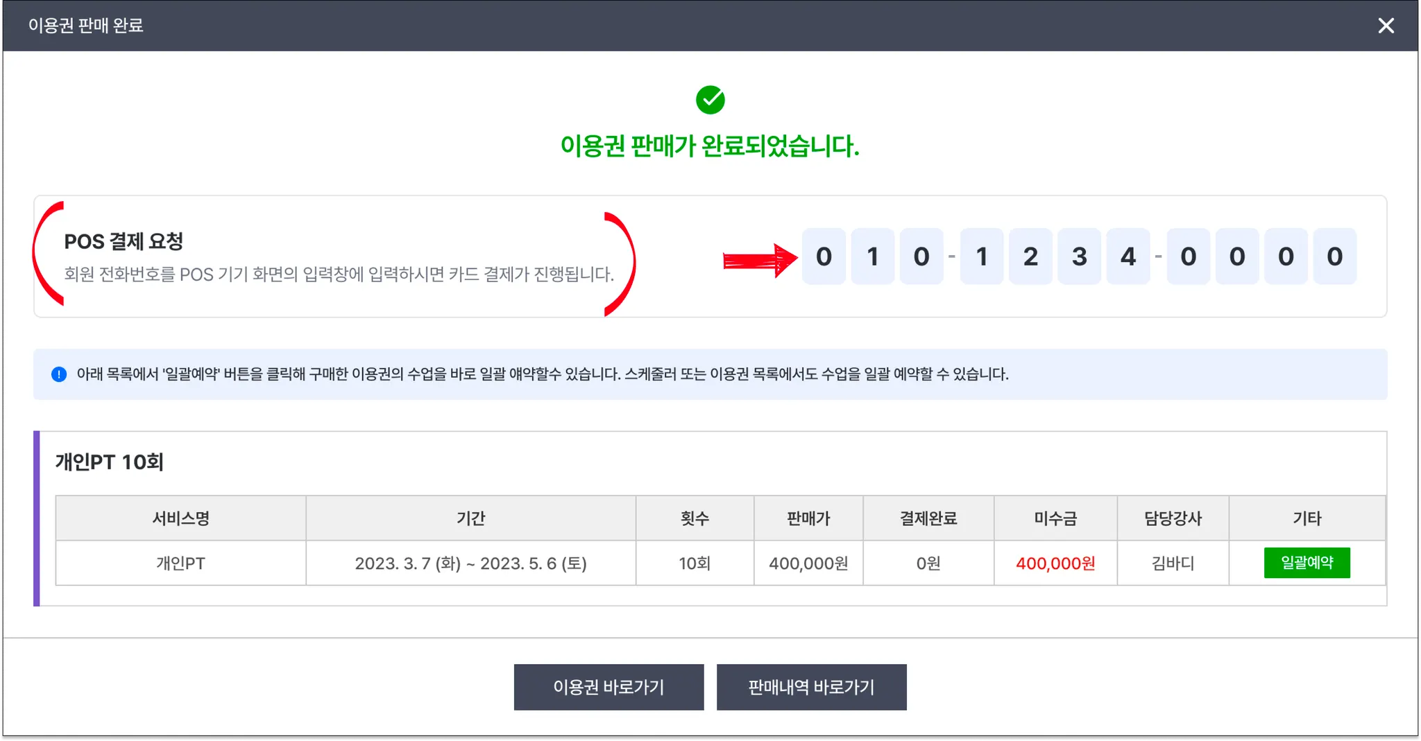 바디코디 CRM에서 POS기로 결제 요청 후, POS기에서 결제까지 완료한 경우, 이용권은 ‘판매’ 상태로 나오고, 즉시 사용할 수 있어요.