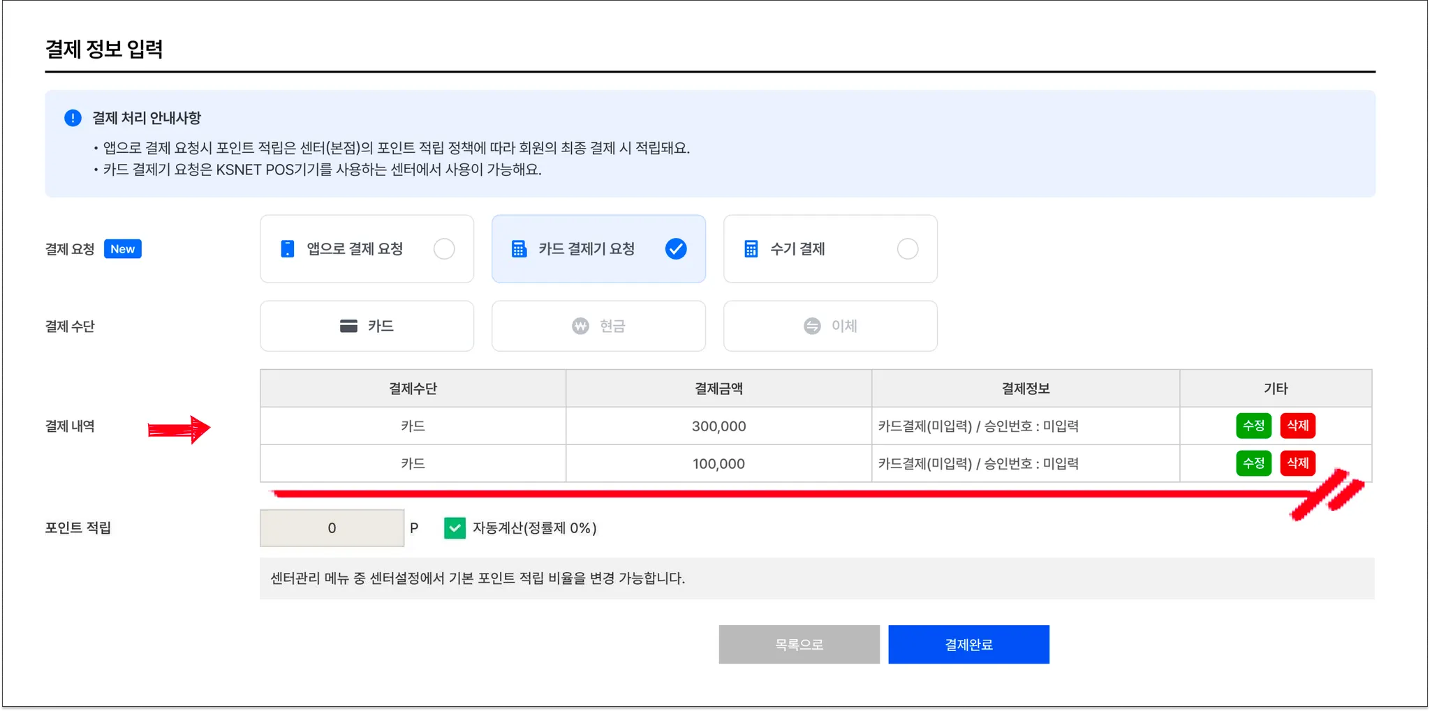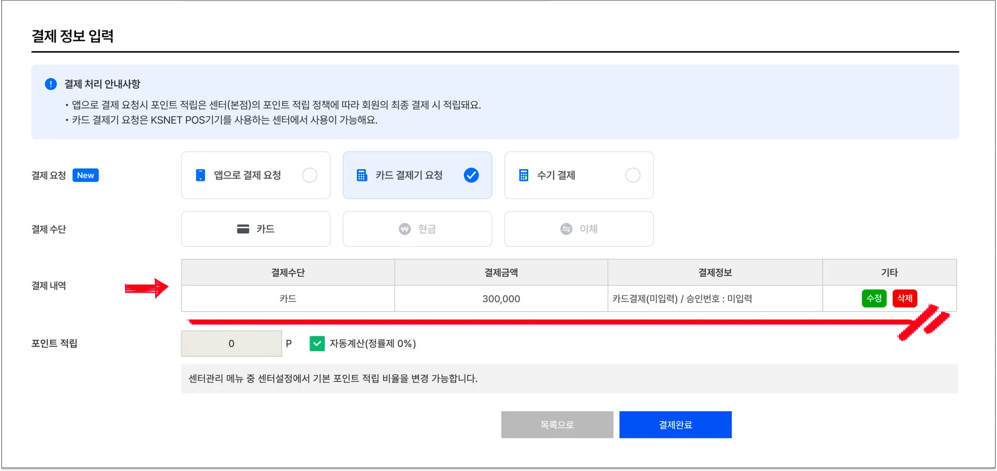 바디코디 CRM에서 KSNET POS기로 결제를 요청할 경우 이용권 판매 시 카드 결제만 등록할 수 있어요.