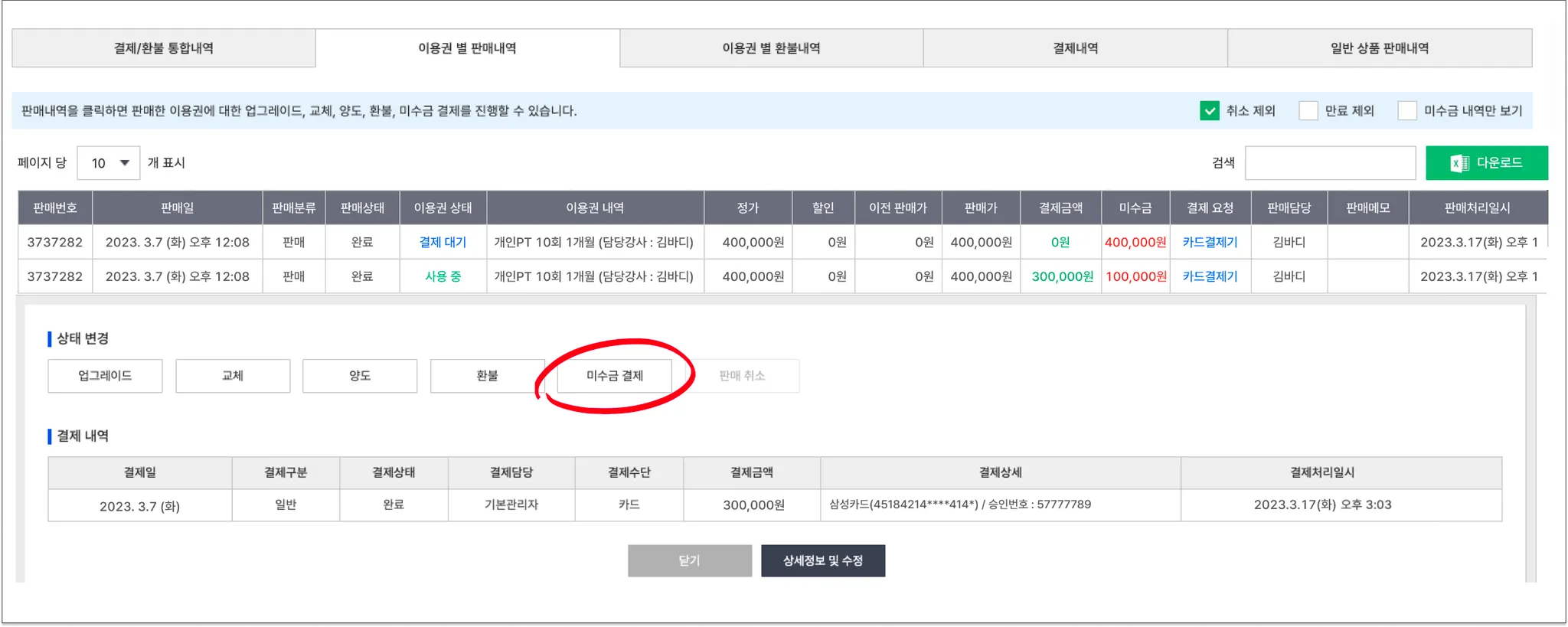 판매 내역을 누르면, 미수금 결제에서 결제 수단을 추가할 수 있어요.