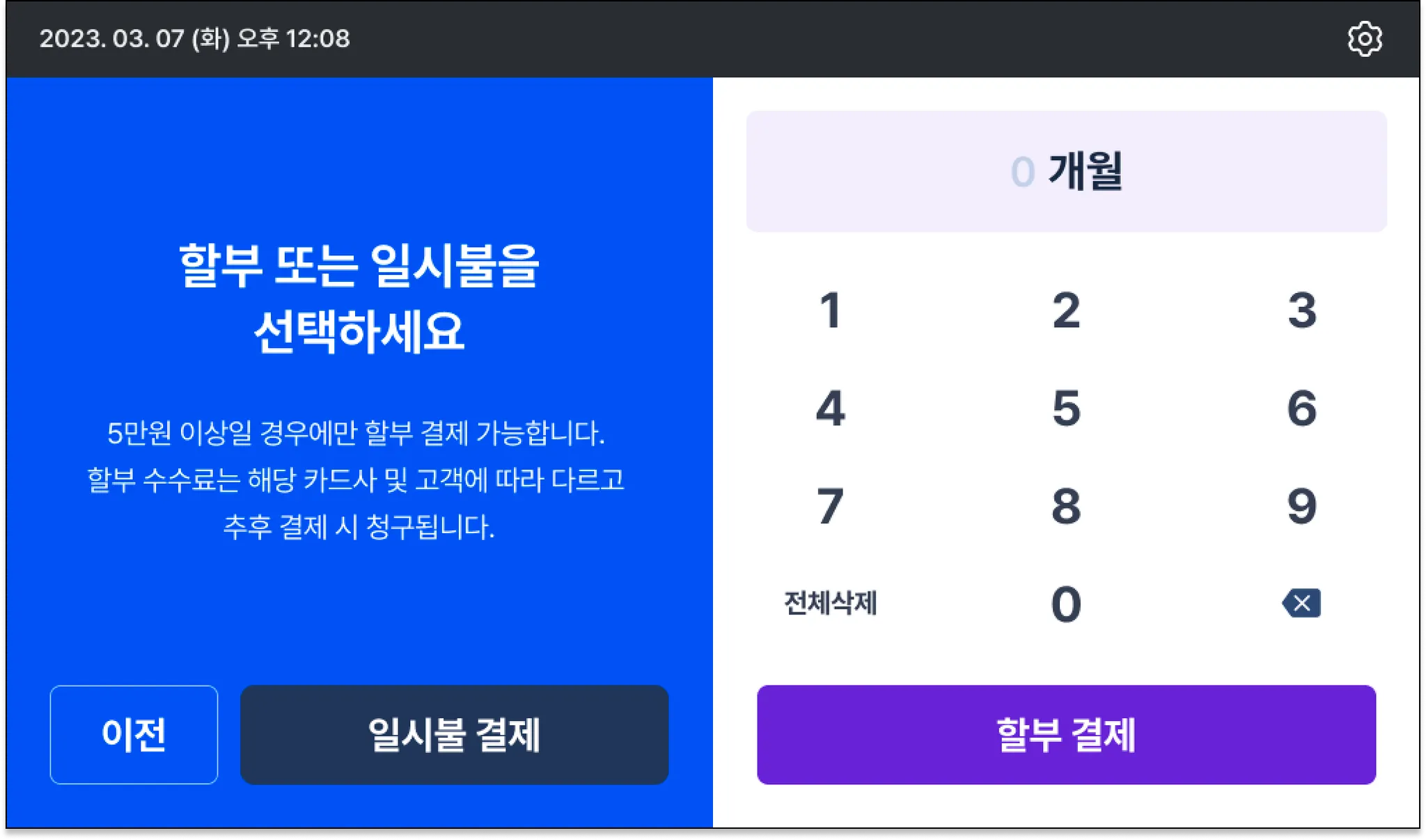 결제 금액이 5만원 이상일 경우, 할부 결제가 가능합니다.