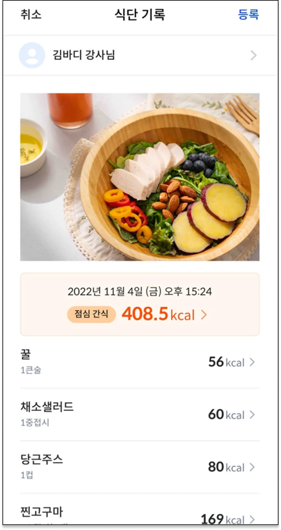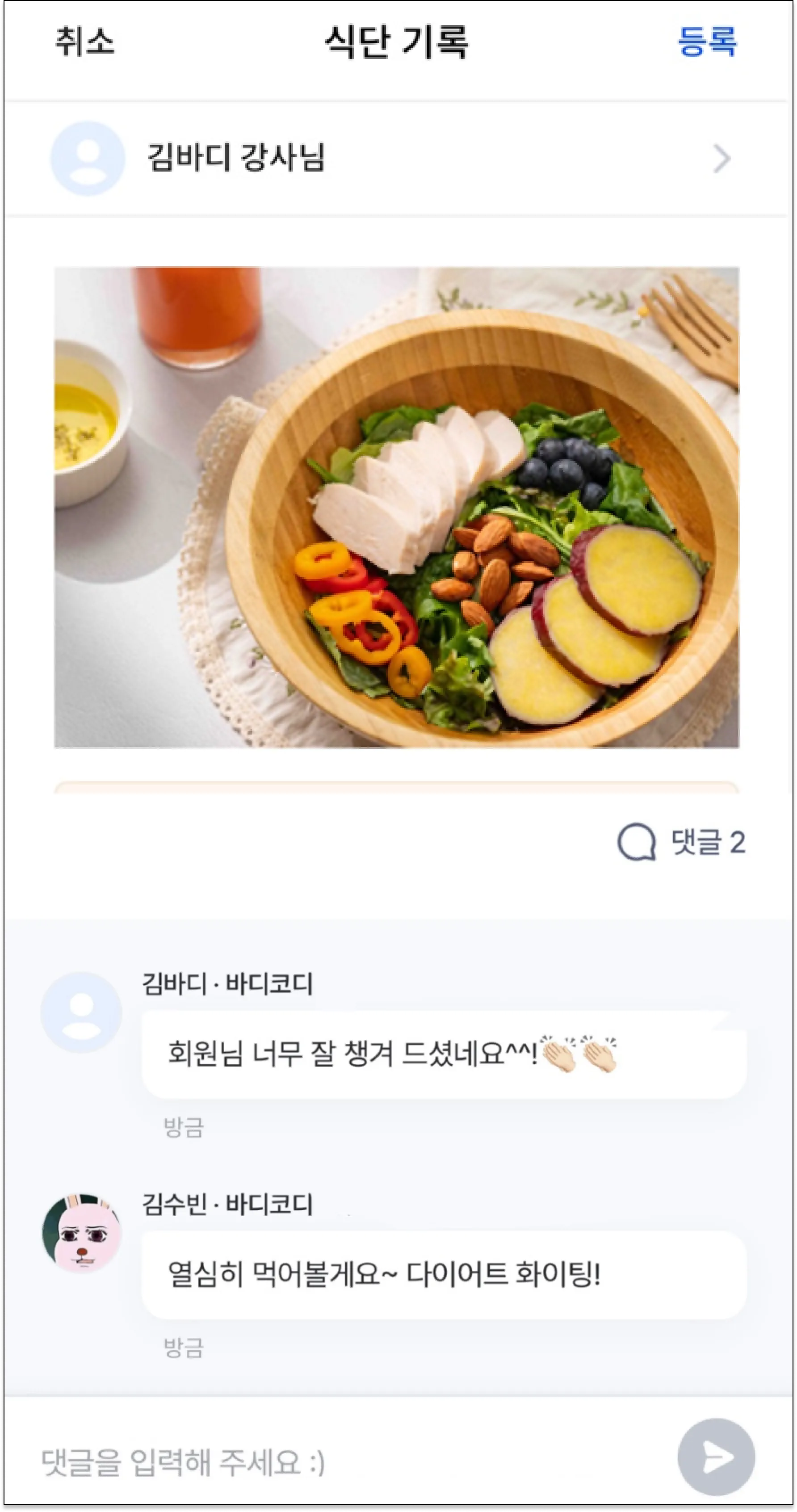 김바디 강사님에게 오늘의 식단을 공유했어요.