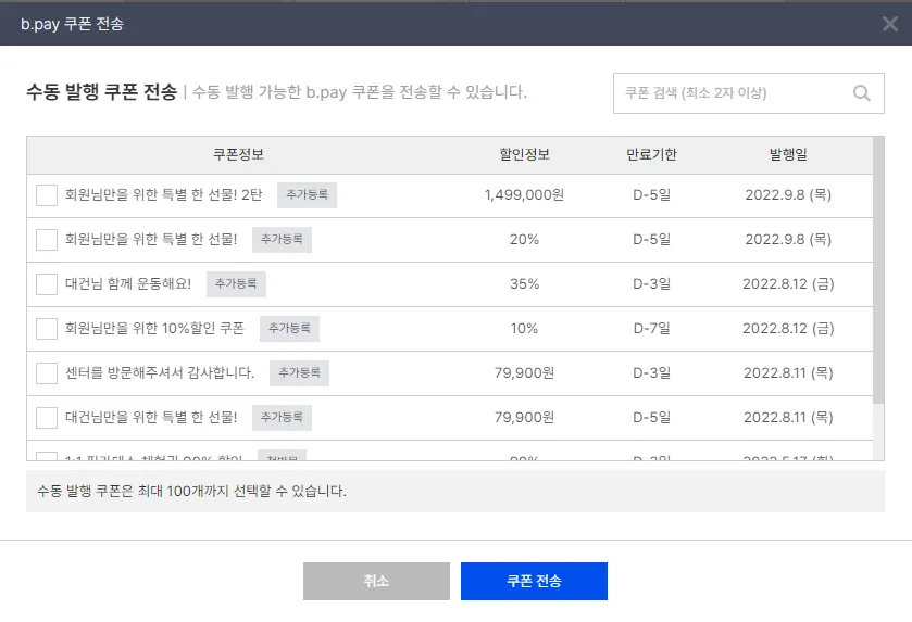검색 리스트 우측 상단에 ‘회원 b.pay쿠폰 전송’을 클릭