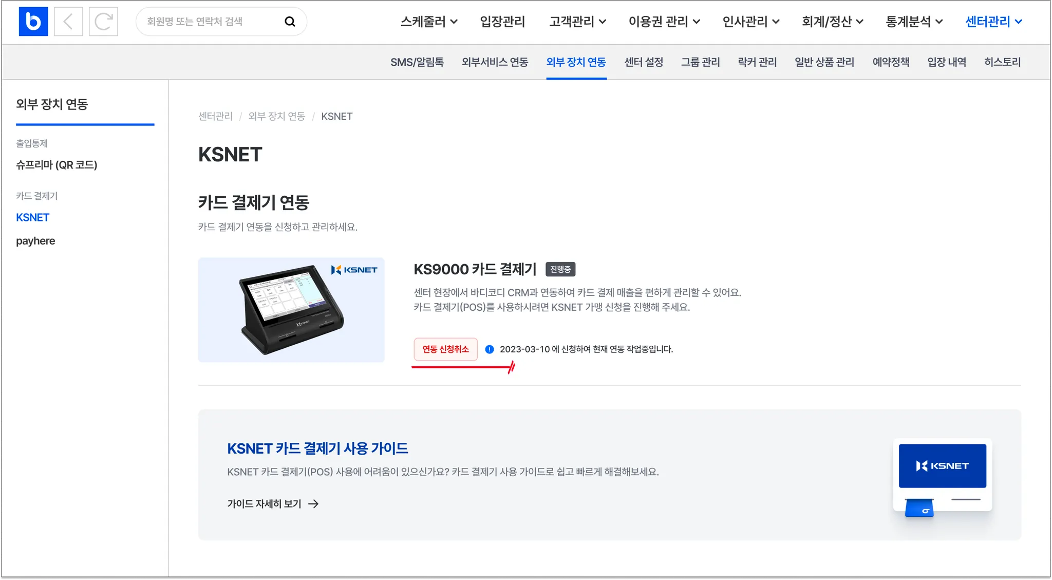 센터관리에 ‘외부 장치 연동’ 메뉴가 생겼어요! 이제 바디코디와 연동되는 외부 서비스들을 관리할 수 있어요.