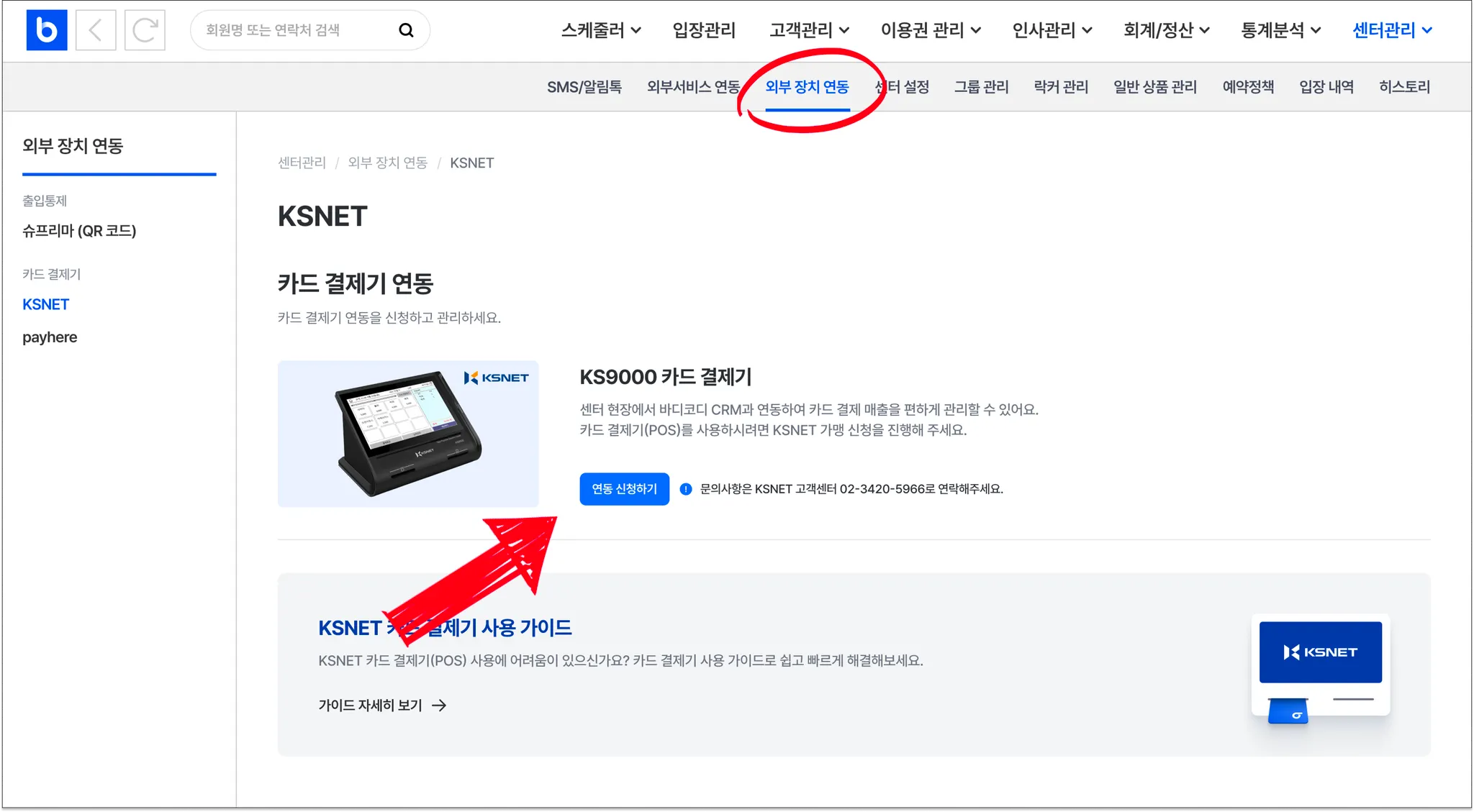 외부 장치 연동의 ‘카드 결제기’에서 KSNET 페이지로 접속해주세요.