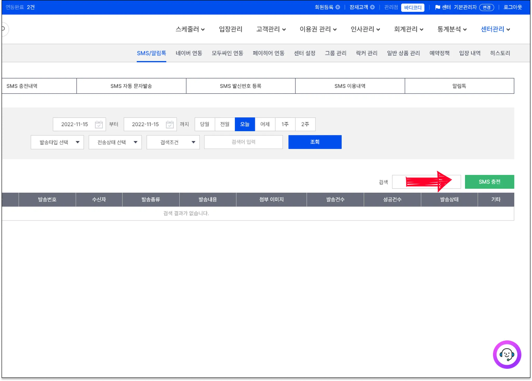 센터관리 > SMS/알림톡 메뉴에서 ‘SMS 충전’ 버튼을 눌러주세요!