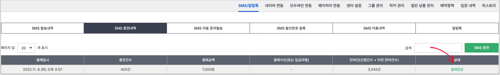 결제까지 완료했다면, SMS/알림톡 > SMS 충전내역에서 결제내역을 확인할 수 있어요.