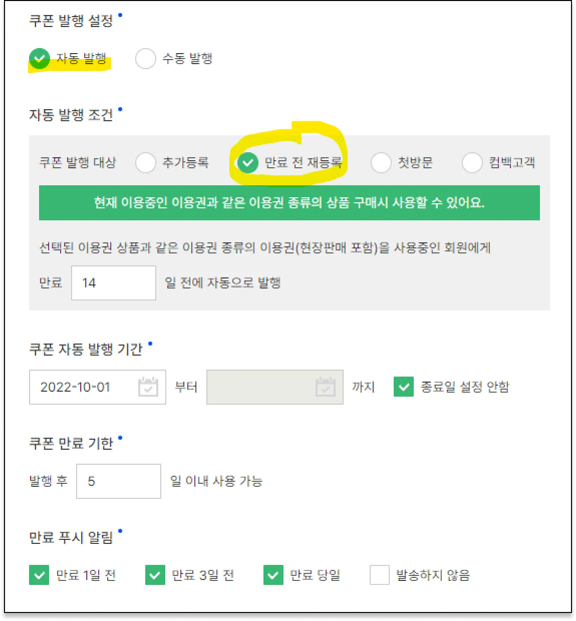 자동 발행조건을 “만료전 재등록” 설정하시면 됩니다.