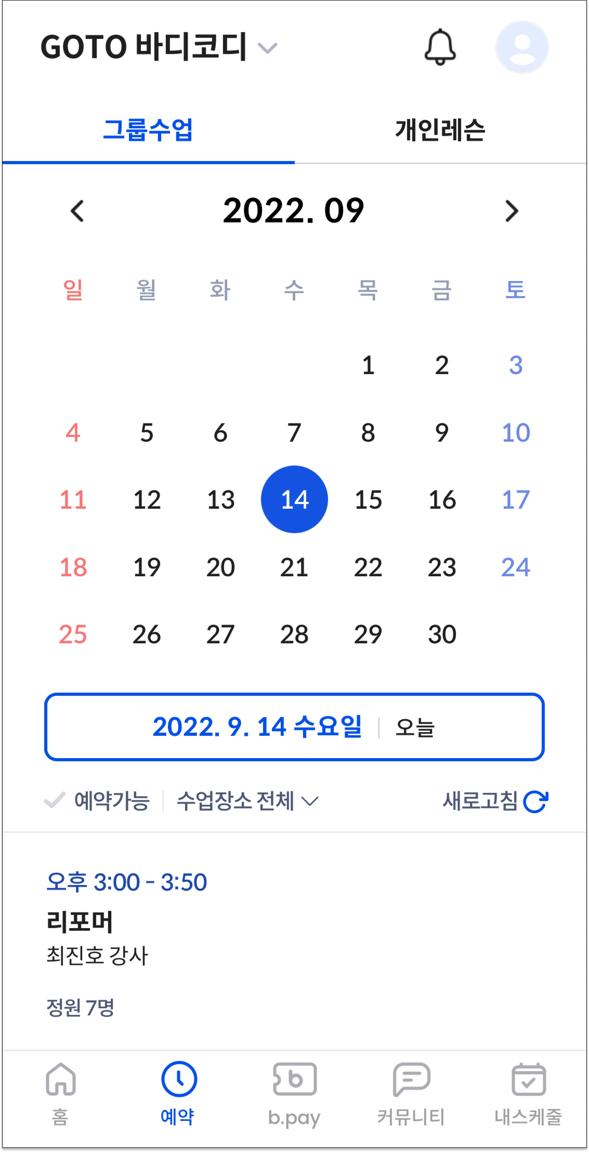 개인레슨처럼, 하단의 예약 메뉴를 눌러 수업 예약화면으로 이동하고, 달력에서 예약할 날짜를 선택해주세요.