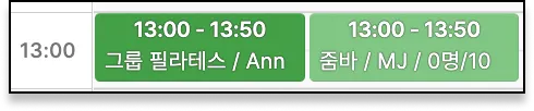 바디코디 스케줄러는 동시간대 그룹수업 스케줄이 여러개 생성되어 있는 경우 해당 시간대가 쪼개어져 스케줄 정보가 표시돼요.