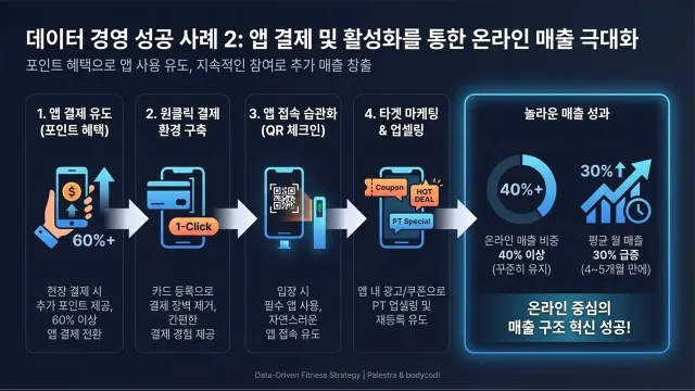 바디코디의 통계를 보면, 온라인 결제 매출 비중이 급격하게 증가하고 있습니다.