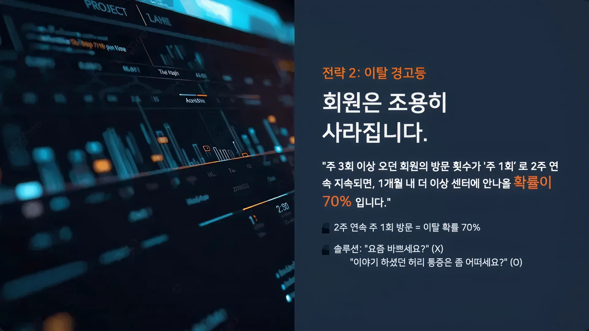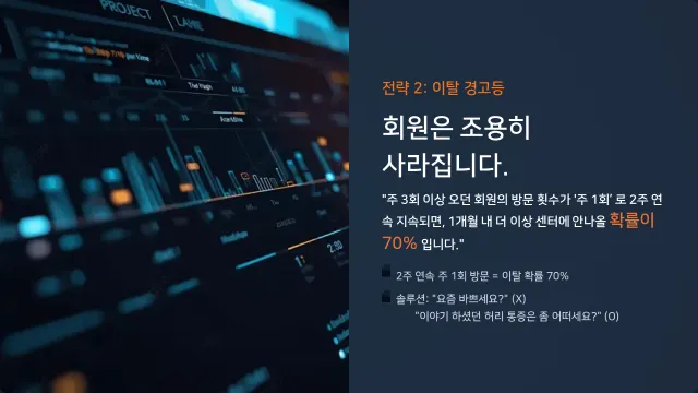 저희 데이터상 이런 패턴을 보인 회원은 한 달 안에 센터에 더 안 나올 확률이 70%에 달했습니다. 운동에 대한 흥미를 잃었거나, 무언가 불만이 생겼다는 강력한 증거죠.