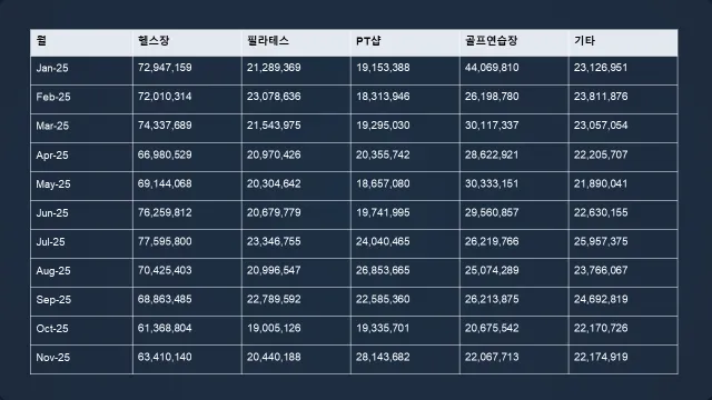 업종은 헬스, 필라테스, 피티, 골프, 그외 종목으로 나누었고, 대형 스포츠센터는 헬스 카테고리에 포함시켰습니다.