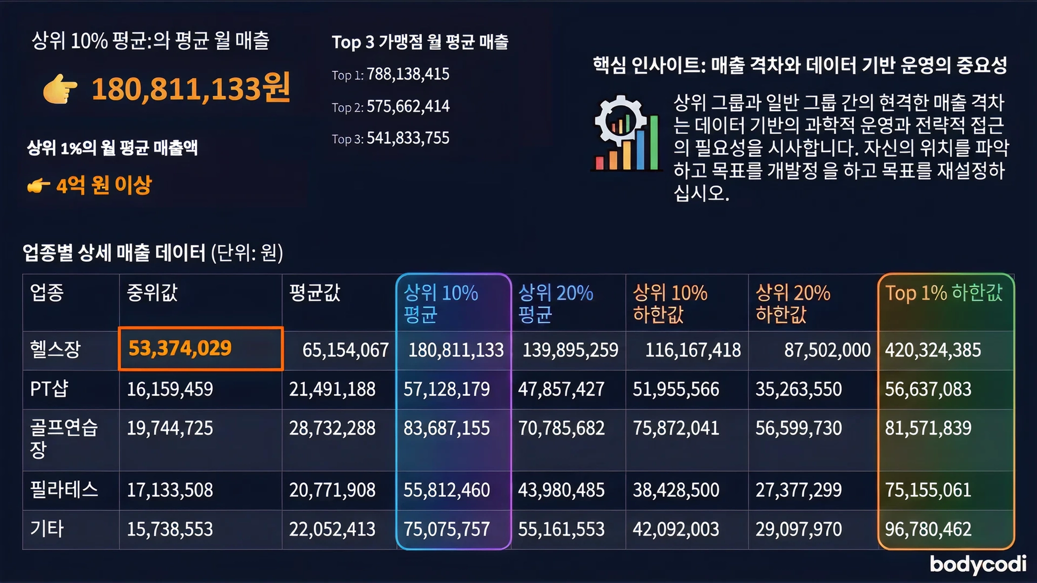 단, 통계는 실제 데이터긴 하지만, 3,500개의 바디코디 가맹점의 데이터 분석 결과로 전체 업계에 대한 통계라고 볼 수는 없습니다.
