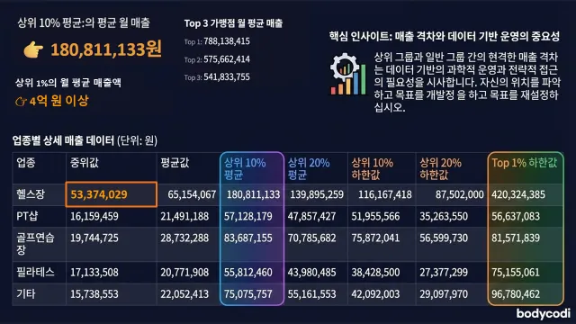 참고로 헬스장 매출 데이터가 높게 나온 이유는 월 매출이 5억 이상인 대형 스포츠센터도 포함했기 때문입니다.