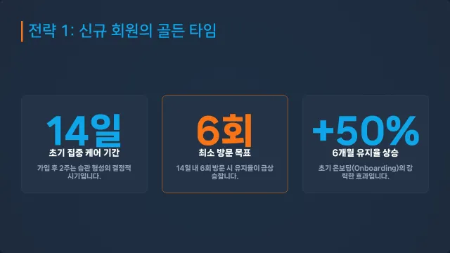 저희 데이터 분석에 따르면, 가입 후 첫 2주, 즉 14일 안에 센터를 4번 이상 방문한 회원은 그렇지 않은 회원보다 6개월 뒤에도 센터를 계속 이용할 확률이 무려 50%나 더 높았습니다.