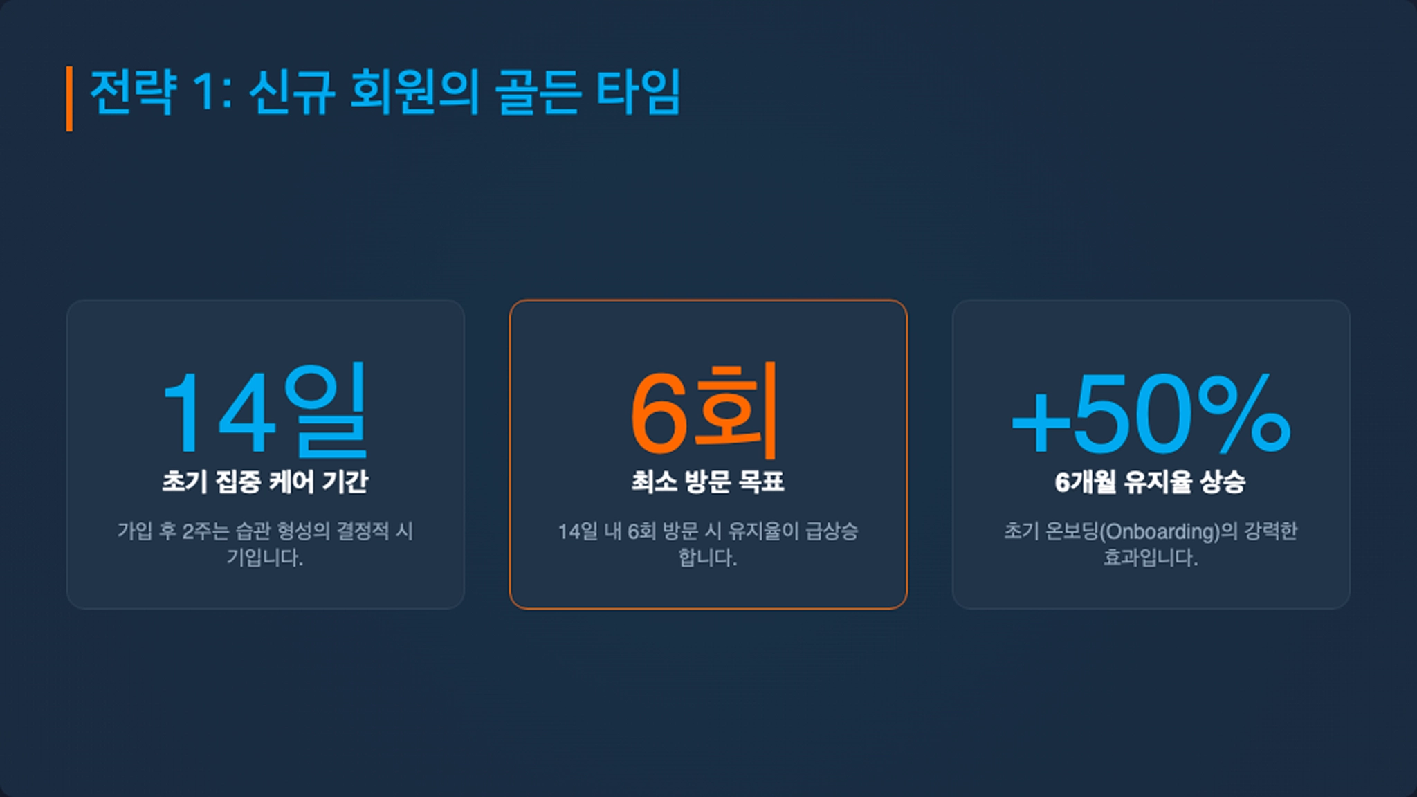 액션 플랜: 가입 당일 감사 문자 → 3일차 불편사항 체크 → 7일차 수업 추천 → 14일차 인바디 점검 및 상담으로 이어지는 체계적인 온보딩 시스템을 구축하십시오.