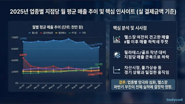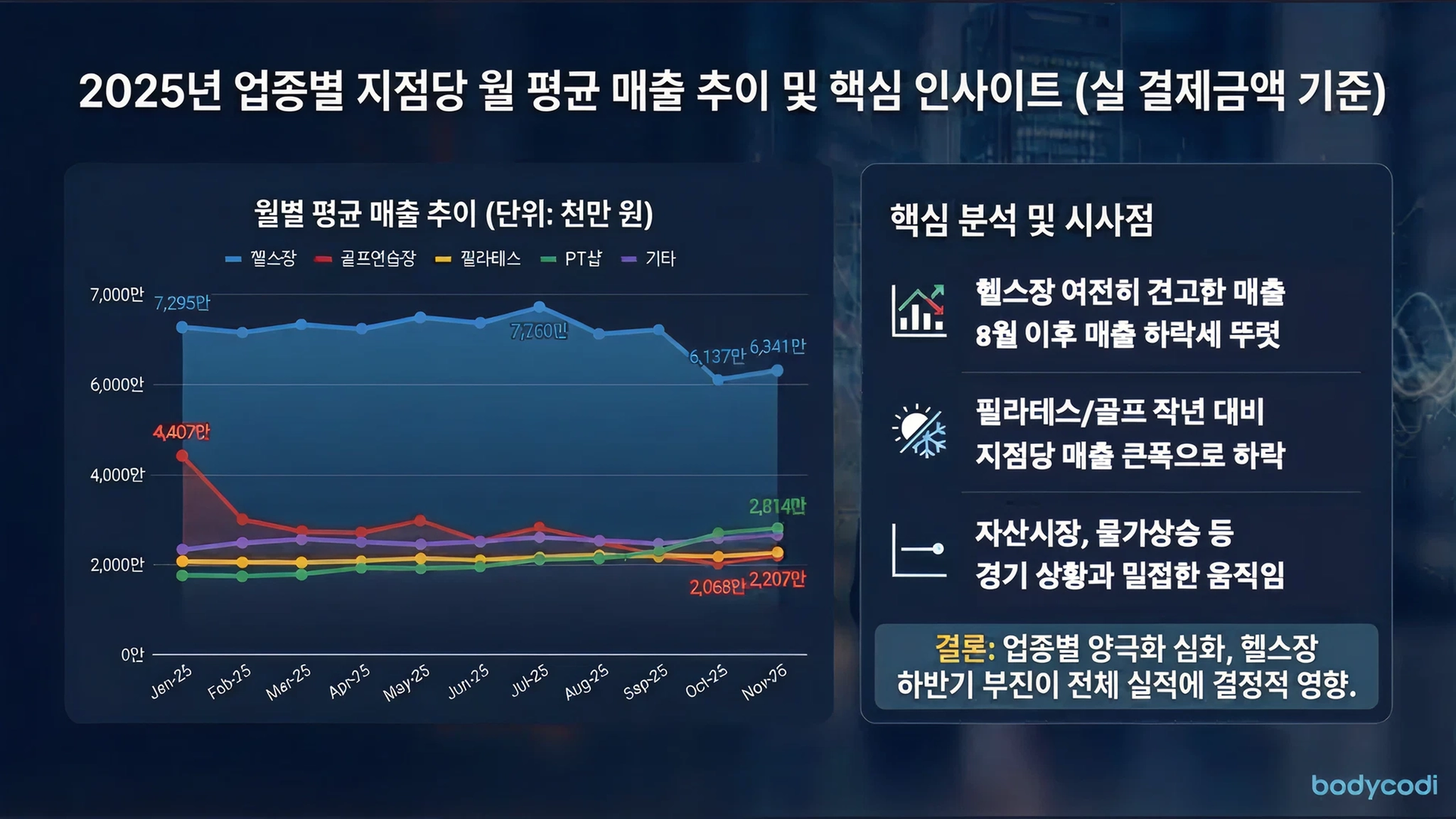 업종별로 양극화 현상이 뚜렷하게 나타나고 있고, 하반기에 총 매출이 하락한 이유는 헬스장 매출 부진이 전체 실적에 결정적인 영향을 미쳤습니다.