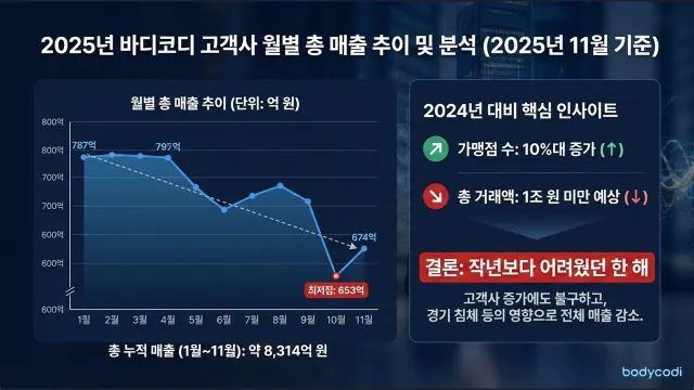 올해 바디코디 가맹점 수는 10% 정도 증가하였지만, 가맹점의 총 매출액은 작년에는 1조원을 넘었지만 올해 11월 까지 아직 8천억원대로 오히려 10% 이상 줄었습니다.
